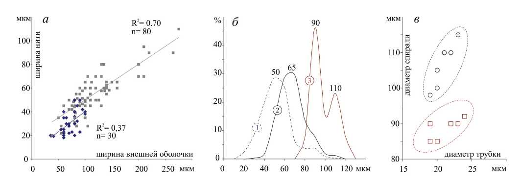Рис. 4. Размеры микрофоссилий свиты Зуун-Арц: а – ширина нитей, наблюдаемая в шлифах (n = 30 – черные нити, n = 80 – красные нити); б – гистограммы распределения: 1 – ширина нитей в шлифах (n = 30), 2 – диаметр трубок в мацерированных препаратах (n = 254), 3 – диаметр спирали Obruchevella ditissima (n = 13); в – соотношение диаметра трубки с диаметром спирали O. ditissima.