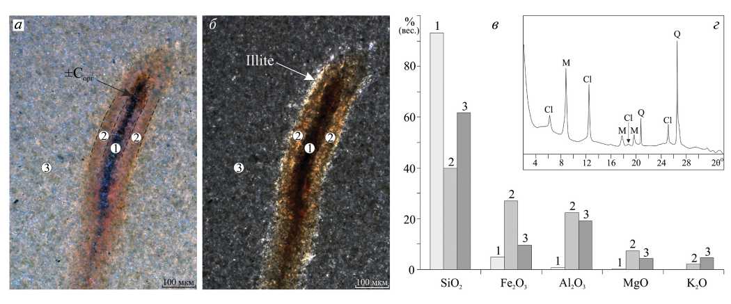 Рис. 5. Химический и минеральный состав нитевидных микрофоссилий и вмещающего аргиллита: а, б – фотографии нити в шлифе при комбинированном освещении (а) и в проходящем свете при скрещенных николях (б); в – средний химический состав нити (1), ее внешней оболочки (2) и вмещающего аргиллита (3) по данным микрозондового анализа без учета органического углерода; г – минеральный состав аргиллита по данным рентген-дифракционного анализа (ориентированный препарат, излучение CuKα): Cl – Fe-хлорит, M – иллит + обломочная слюда, Q – кварц.