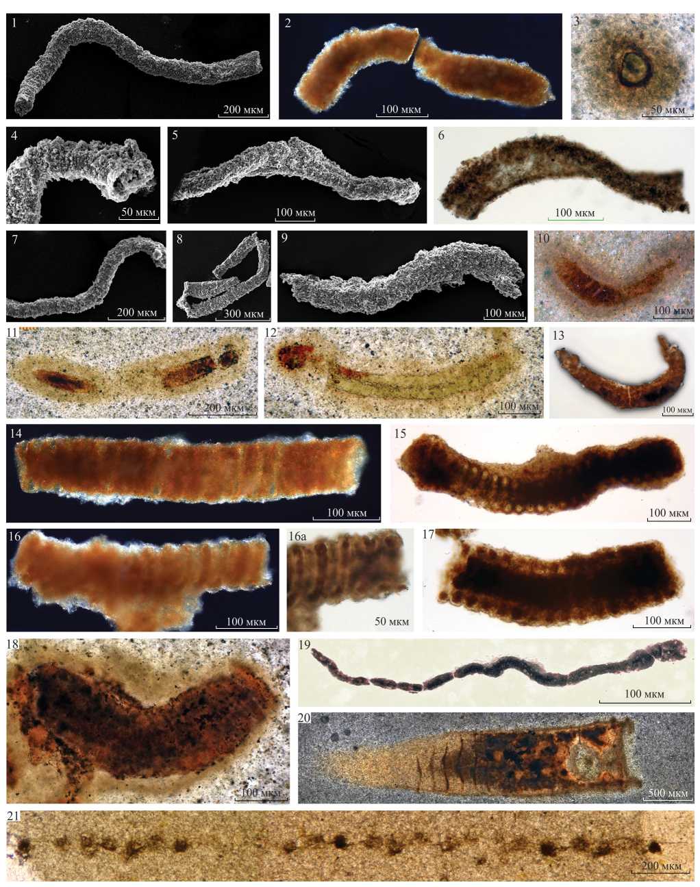 В шлифах обнаружены единичные формы, которые не сохраняются при мацерации. Они включают в себя крупные и короткие сегментированные трубки, схожие с представителями рода Pararenicola Wang (табл. I, фиг. 18), трихомы с клетками удлиненно-цилиндрической формы высотой 12–35 мкм, аналогичные Nochtuija prima Yakschin (табл. I, фиг. 19), а также однорядные бусиноподобные нити, предположительно, Horodyskia minor Dong et al. (табл. I, фиг. 21). В шлифе также встречена крупная одиночная трубка, диагностированная как Zuunia chimidtsereni Yang et al. (табл. I, фиг. 20).