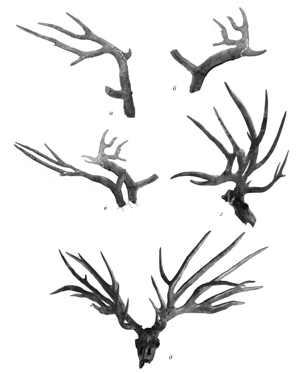 Рис. 4. Виды Eucladoceros: а–в – Е. orientalis (Radulesco et Samson, 1967), голотип ПИН, № 4378/1, правый рог: а – переднемедиальный вид, б – вид с медиальной стороны, в – реконструкция постановки рогов; Предкавказье, Псекупс; нижний плейстоцен; г, д – E. dicranios (Nesti, 1841), голотип IGF 270, череп с рогами: г – вид сбоку (без левого рога), д – вид спереди; Италия, Верхнее Вальдарно; нижний плейстоцен.