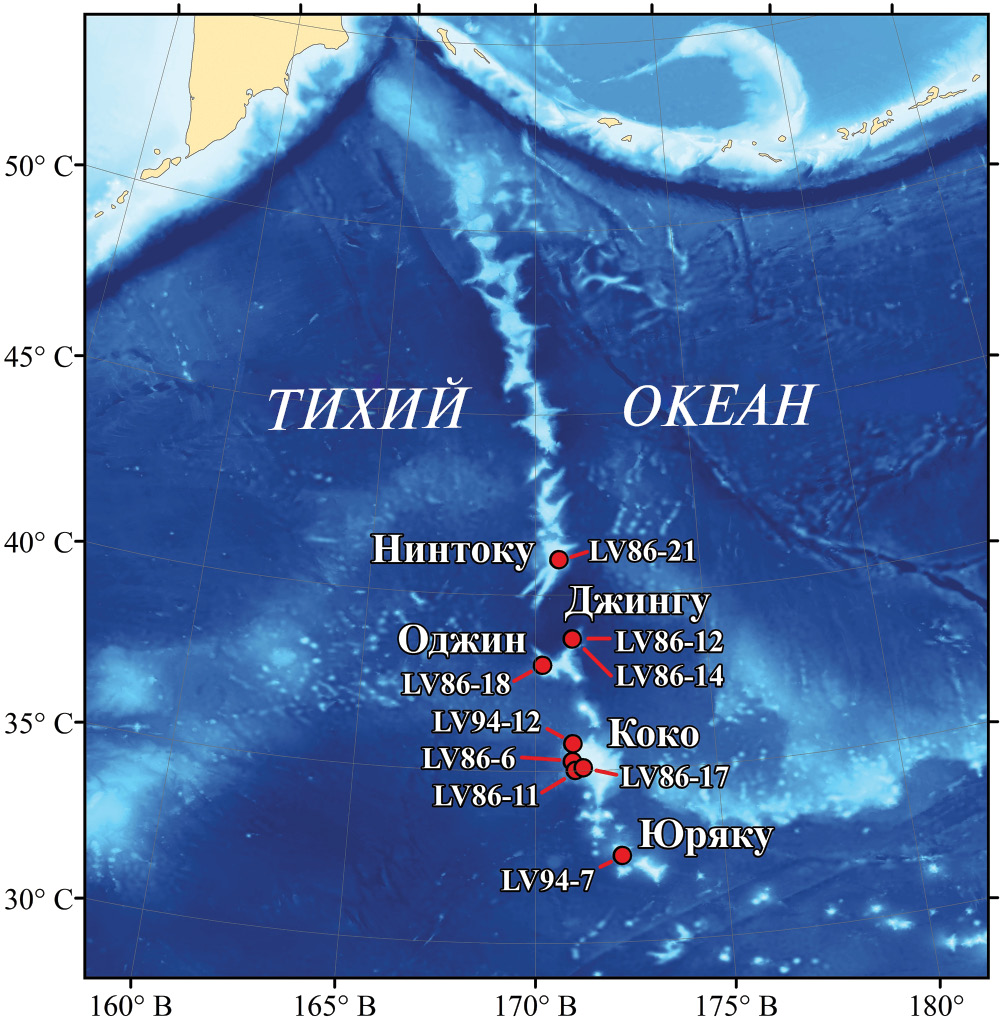 Геологические образцы отбирались в южной части Императорского хребта на гайотах Нинтоку, Джингу, Оджин, Коко и Юряку с помощью телеуправляемого подводного аппарата “Comanche 18”, оснащенного манипуляторами и пробоотборниками для сбора донных осадков (Галкин и др., 2020) (табл. 1).