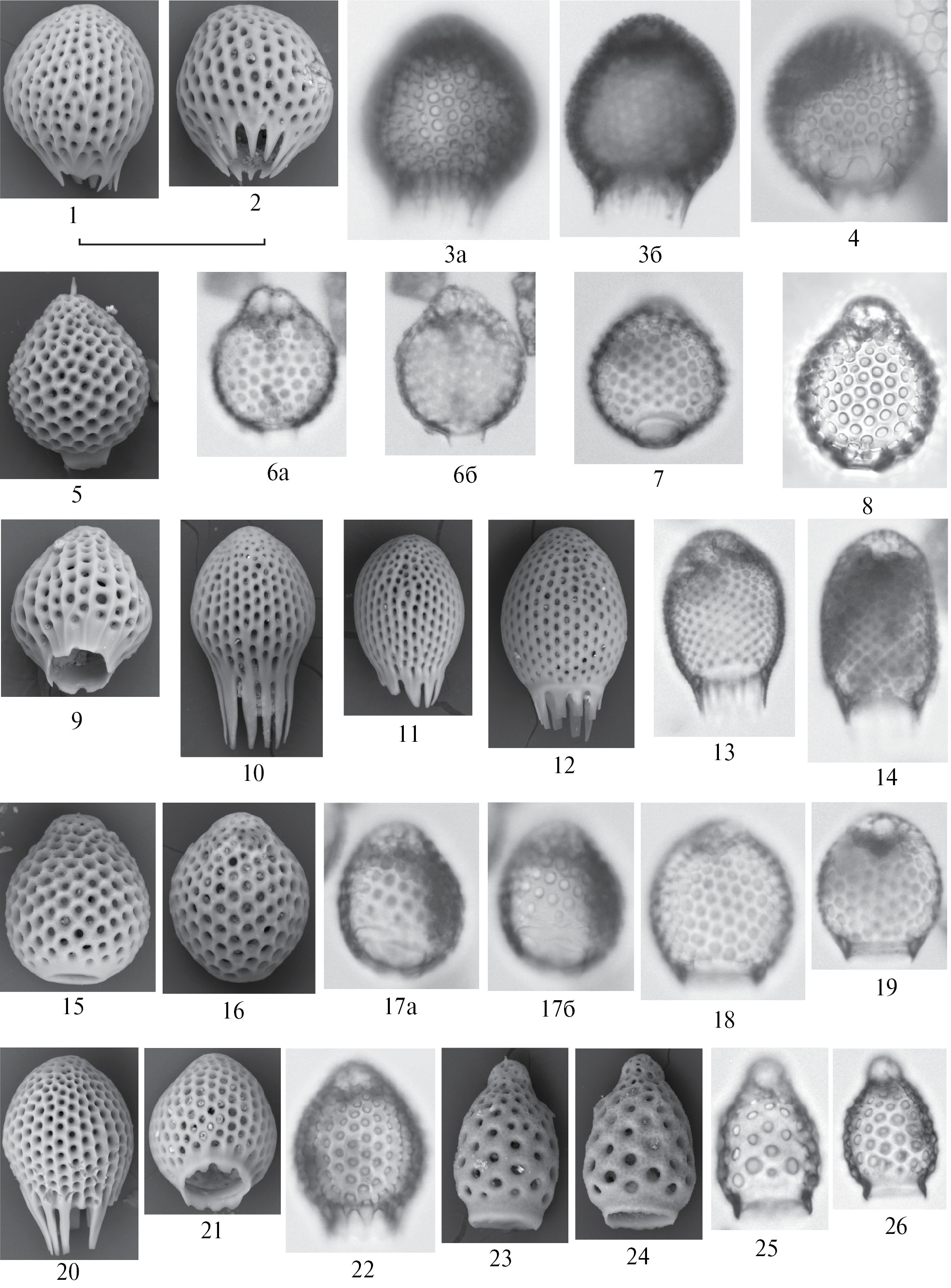 Все: Императорский хребет, современные осадки: гайот Нинтоку (обр. LV86-21, 0–3 см, глубина 1161 м: фиг. 22); гайот Джингу (обр. LV86-12, 0–3 см, глубина 1935 м: фиг. 8, 16, 20; обр LV86-14, 0–3 см, глубина 1446 м: фиг. 9, 11, 15, 24); гайот Оджин (обр. LV86-18, 0–3 см, глубина 1531 м: фиг. 25, 26); гайот Коко (обр. LV86-6, глубина 1995 м: фиг. 3; обр. LV86-17, 0–3 см, глубина 1440 м: фиг. 13; керн LV94-12-К2, глубина 2231–2242 м: обр. LV94-12-К2-2, 1–2 см: фиг. 1, 2, 5, 10, 12, 17, 21, 23; обр. LV94-12-К4-2, 4-5 см: фиг. 4, 18, 19; обр LV94-12-К2-6, 6–7 см: фиг. 6, 14); гайот Юряку (обр. LV94-7-К7-2, 1–2 см, глубина 1249 м: фиг. 7). Длина масштабной линейки 100 мкм.