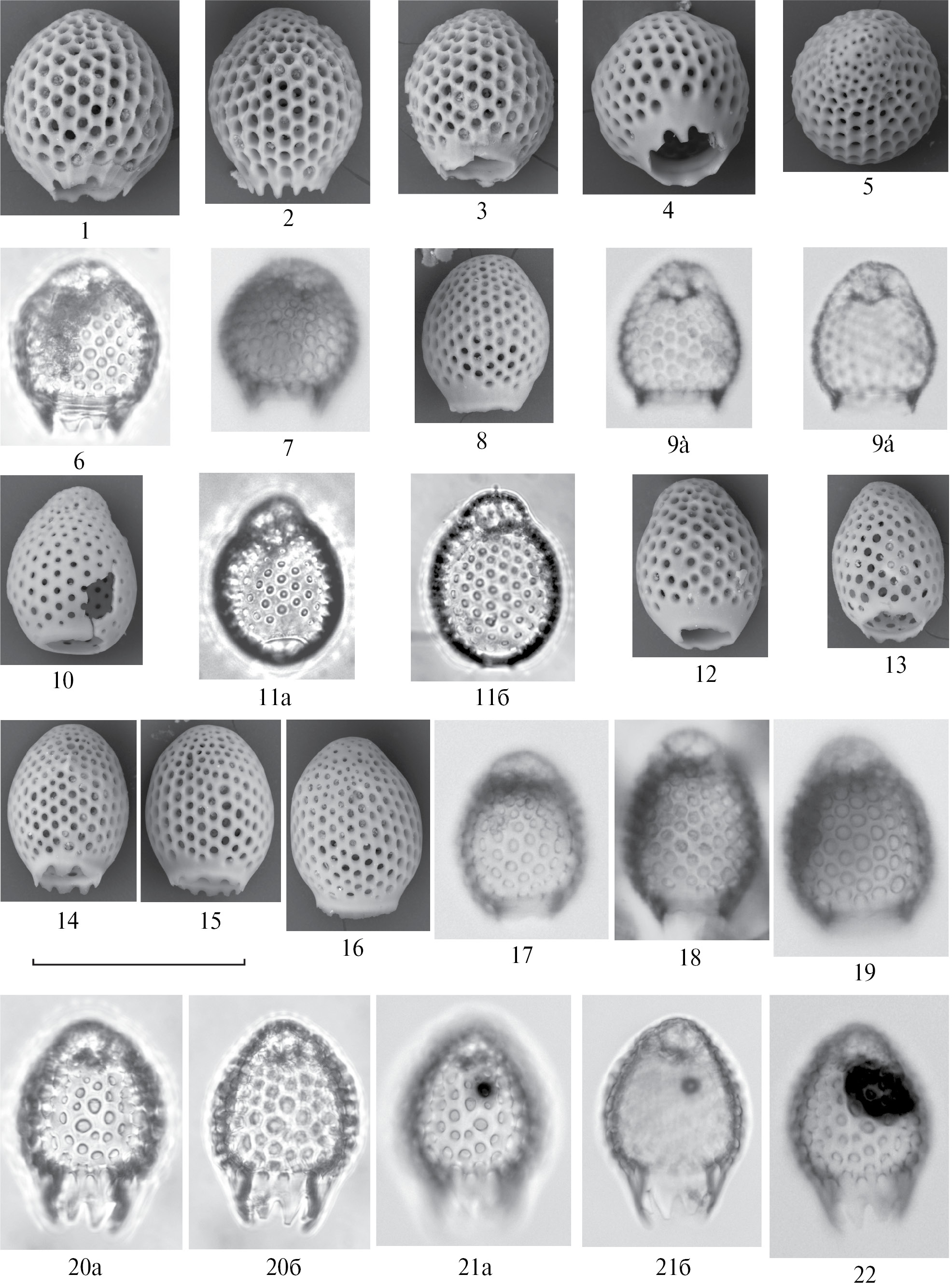 Все: Императорский хребет, современные осадки: гайот Джингу (обр. LV86-12, 0–3 см, глубина 1935 м: фиг. 2, 3, 5, 8, 10, 12, 17, 19-22; обр. LV86-14, 0–3 см, глубина 1446 м: фиг. 1, 4, 6, 7, 11); гайот Коко (керн LV94-12-К2, глубина 2231–2242 м: обр. LV94-12-К2-2, 1–2 см: фиг. 9, 13–16, 18). Длина масштабной линейки 100 мкм.