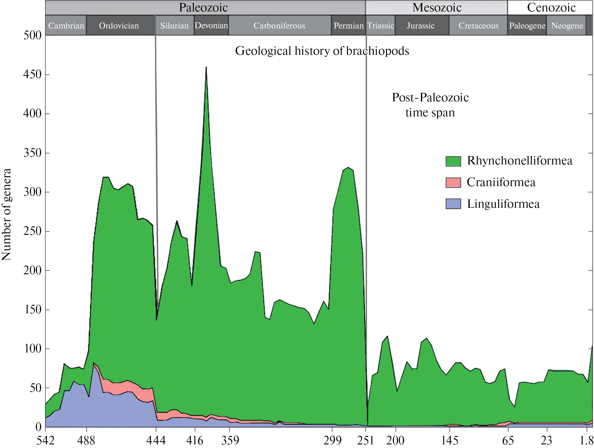 У брахиопод богатая палеонтологическая история. Постпалеозойский временной промежуток (Carlson, 2016) наибольшим образом повлиял на эволюцию Rhynchonelliformea. Он начался после пермско-триасового вымирания, при котором исчезло около 94–96% видов брахиопод (Shi, Shen, 2000; Shu-Zhong, Shi, 2002), и длится до настоящего времени. Этот временной промежуток характеризуется относительным падением численности и изменением таксономического состава брахиопод (рис. 2). Важно, что в мезозое именно ринхонеллиформные брахиоподы пострадали наибольшим образом. Так, во время пермско-триасового вымирания полностью исчезло четыре отряда (Dictyonellida, Orthotetida, Orthida, Spiriferida), а в первой половине мезозоя вымерло еще три отряда (Productida, Spiriferidina, Athyridida) ринхонеллиформных брахиопод (Curry, Brunton, 2007). В то же время среди Craniiformea и Linguliformea не произошло сокращения численности на сопоставимом c ринхонеллиформными брахиоподами уровне: перед пермско-триасовым вымиранием они были представлены отрядами Lingulida и Craniida, которые сохранились до настоящего времени (Curry, Brunton, 2007).
