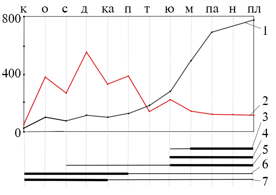 Рис. 3. Связь родового разнообразия двустворчатых моллюсков и брахиопод с качественным составом фитопланктона в фанерозое (по: Zezina, 2008, с изменениями). По вертикали для графиков 1, 2 указано количество родов, по горизонтали для 1–7 – палеонтологические периоды. Обозначения: 1 – двустворчатые моллюски, 2 – брахиоподы, 3 – диатомовые водоросли, 4 – кокколитофориды, 5 – динофитовые водоросли, 6 – зеленые водоросли, 7 – цианобактерии; к – кембрий, о – ордовик, с – силур, д – девон, ка – карбон, п – пермь, т – триас, ю – юра, м – мел, па – палеоген, н – неоген, пл – плейстоцен.