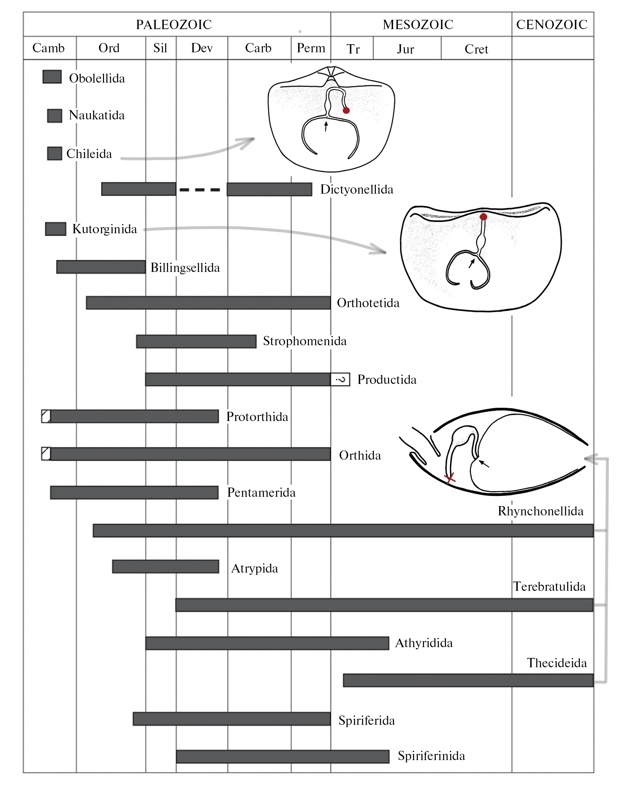 Морфология кишечной трубки ископаемых брахиопод может быть реконструирована по отпечаткам мягких тканей, которые сохраняются в лагерштеттах. Было обнаружено, что в раннем кембрии лингулиформные брахиоподы имели U-образный кишечник, который открывался анусом в мантийную полость с правой стороны (Zhang et al., 2004, 2007a). Такую морфологию кишечной трубки сохранили и современные лингулиформные брахиоподы (см. главу 4). Также имеются отпечатки мягких тканей представителей двух раннекембрийских классов ринхонеллиформных брахиопод – Chileata и Kutorginata. При этом у хилеат кишечная трубка имеет такую же морфологию, как у лингулиформных брахиопод (рис. 4; Zhang et al., 2007b), а у куторгинат кишечник прямой и открывается анальным отверстием сзади между створками раковины (рис. 4; Rowell, Caruso, 1985; Zhang et al., 2007c). Таким образом, можно предположить, что сквозной кишечник, вероятно, является плезиоморфным признаком для брахиопод. По-видимому, замыкание кишечника Rhynchonelliformea произошло в конце раннего палеозоя или в средне–позднем палеозойском временном промежутке (рис. 2, 4).