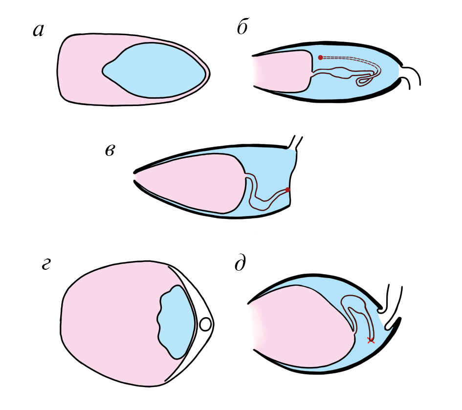 Рис. 6. Расположение мантийной полости (выделена розовым цветом) и туловищного целома (выделен голубым цветом) внутри раковины брахиопод (по: Rowell, Caruso, 1985; James et al., 1992; с изменениями): а, б – Lingula anatina (Linguliformea): а – вид со спинной стороны, б – вид сбоку; в – Nisusia sulcata (Rhynchonelliformea: Kutorginata), вид сбоку; г, д – Magellania sp. (Rhynchonelliformea: Rhynchonellida): г – вид со спинной стороны, д – вид сбоку. Красными точками обозначено анальное отверстие кишечника, крестом – слепое замыкание кишечника.