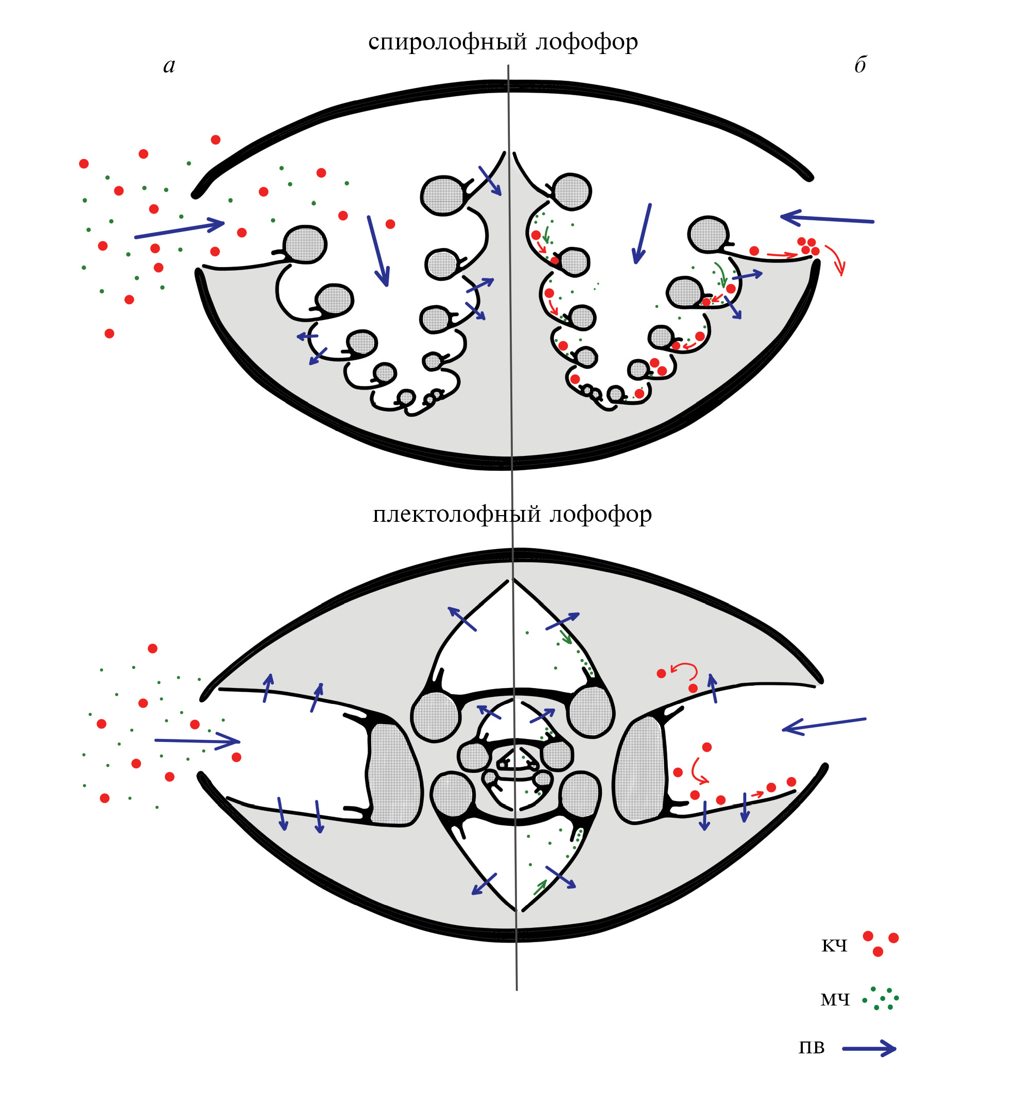 Механизм фильтрации брахиопод подробно изучен в ряде публикаций (Chuang, 1956; Atkins, Rudwick, 1962; Rudwick, 1962; Strathmann, 1973; Gilmour, 1978, 1981; Labarbera, 1981; Thayer, 1986; Dhar, 1997). Щупальца лофофора разделяют мантийную полость на вводную и выводную камеры (рис. 9). Ток воды создается за счет биения латеральных ресничек, которые бьют от фронтальной стороны к абфронтальной. Вода поступает во вводную камеру, проходит между щупальцами и попадает в выводную камеру (рис. 8, а). На границе вводной и выводной камер происходит захват пищевых частиц. Пойманные частицы переносятся с помощью фронтальных ресничек, бьющих в сторону основания щупалец, и попадают в пищевой желобок. В принятии частиц, главным образом, участвуют наружные щупальца (Gilmour, 1978, 1981; Dhar, 1997). В пищевом желобке частицы окружаются слизью и транспортируются ко рту.