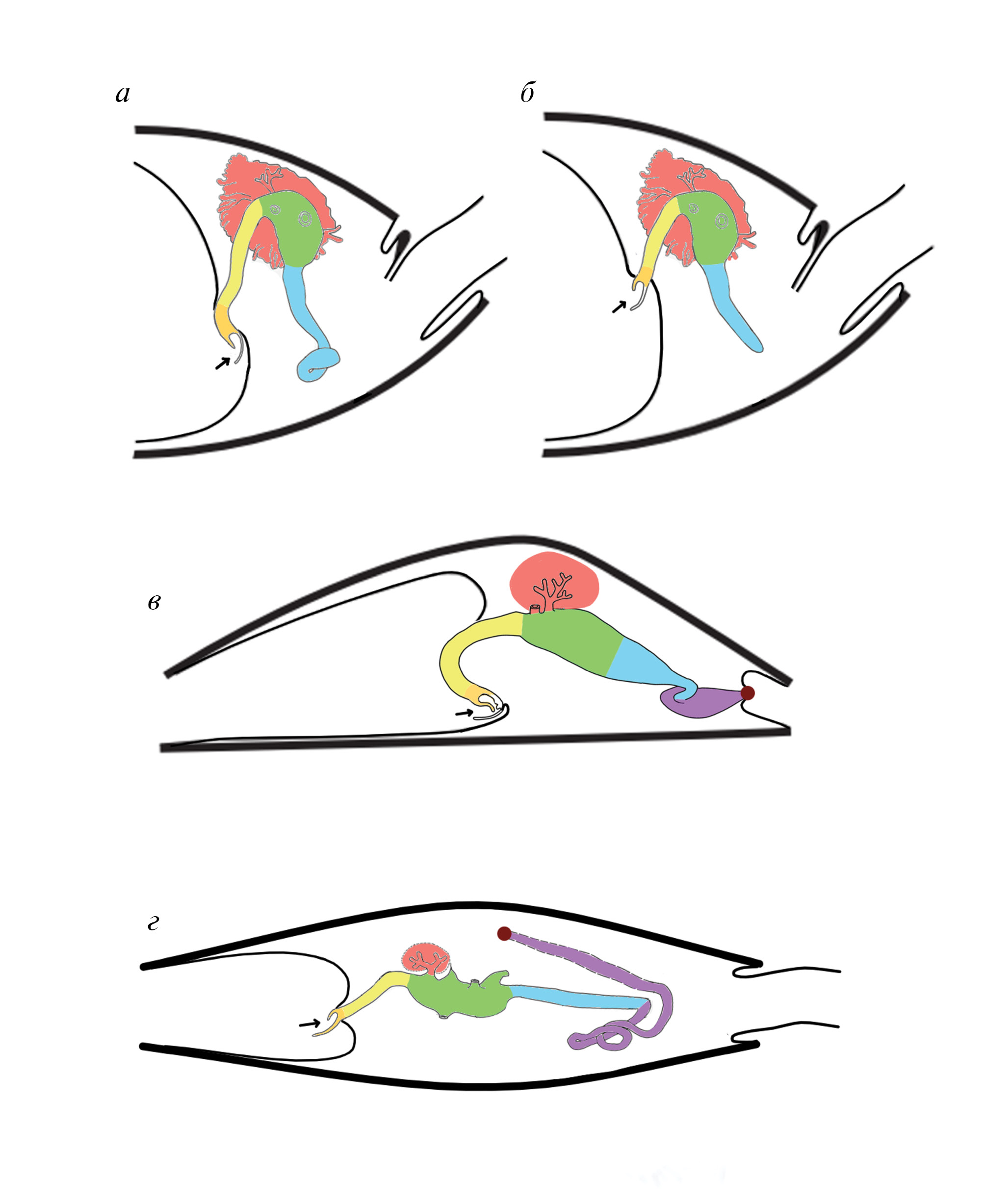 Рис. 13. Морфология пищеварительной системы брахиопод (по: Nielsen, 1991, с изменениями): а – Hemithiris psittacea (Rhynchonelliformea: Rhynchonellida), слепо замкнутый кишечник с расширением на конце (оригинальная схема); б – Rhynchonelliformea: Terebratulida, слепо замкнутый кишечник без расширения (оригинальная схема); в – Novocrania anomala (Craniiformea), кишечник сквозной и открывается анальным отверстием на задней стороне тела (по: Chuang, 1960); г – Lingula anatina (Linguliformea), U – образный сквозной кишечник открывается анальным отверстием в мантийную полость справа ото рта (по: Chuang, 1959). Оранжевым цветом обозначены рот и глотка, желтым обозначен пищевод, зеленым – желудок, красным – пищеварительная железа, голубым – пилорический отдел, фиолетовым – задний отдел кишечника. Стрелки указывают на ротовое отверстие, точками обозначено анальное отверстие кишечника.