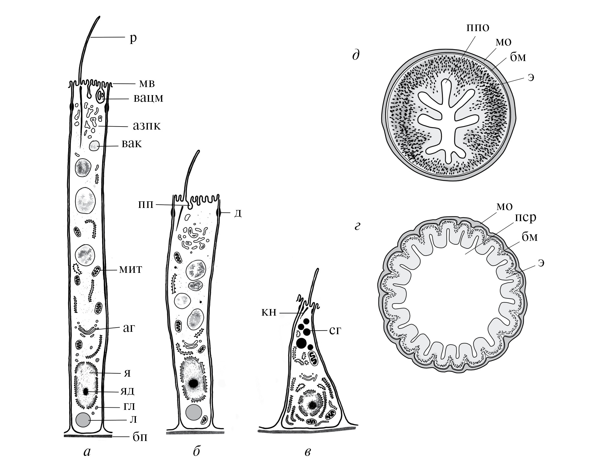 Рис. 14. Особенности микроскопической анатомии кишечной трубки ринхонеллиды Hemithiris psittacea (по Пунину, 1981, с изменениями): а – ультраструктура клеток слепого расширения пилорического отдела, б – ультраструктура пищеварительных клеток пищеварительной железы, в – ультраструктура секреторных клеток пищеварительной железы, г – поперечный срез через среднюю часть пилорического отдела кишечника, д – поперечный срез слепого расширения пилорического отдела. Границы клеток на фиг. г, д не обозначены. Обозначения: аг – аппарат Гольджи, азпк - апикальная зона пузырьков и канальцев, бм – базальная мембрана, бп – базальная пластинка, вак – вакуоль, вацм – впячивания апикальной цитоплазматической мембраны, гл – гранула липофусцина, д – десмосома, кн – корешковая нить, л – липидное включение, мв – микроворсинки, мит – митохондрия, мо – мышечная обкладка, пп – пиноцитозный пузырек, ппо – просвет пилорического отдела, пср – просвет слепого расширения пилорического отдела, р – ресничка, сг – секреторная гранула, э – эпителий, я – ядро, яд – ядрышко.