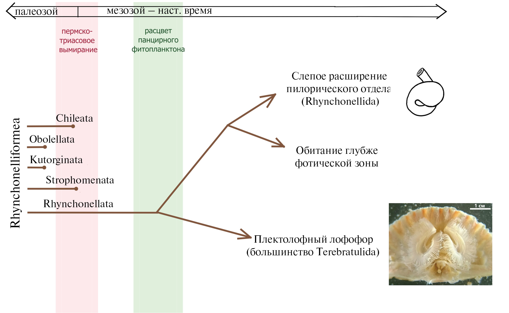 Мы предлагаем следующую гипотезу эволюции ринхонеллиформных брахиопод после пермо-триасового вымирания (рис. 15). Часть отрядов ринхонеллиформных брахиопод со слепо замкнутым кишечником, столкнувшиеся с новым панцирным фитопланктоном в мезозое, вымерли, некоторые представители стали либо жить на глубине ниже фотической зоны, как большинство современных ринхонеллид, либо приспособились к новому типу пищи. Так, некоторые виды ринхонеллид, такие как H. psittacea и N. nigricans, обитающие в фотической зоне, вероятно, используют слепое расширение пилорического отдела кишечника для уменьшения объема непереваренных остатков. В то же время теребратулиды с плектолофным лофофором получили преимущество перед другими брахиоподами за счет высокой эффективности фильтрационного аппарата, который способен отсортировывать крупный панцирный планктон.
