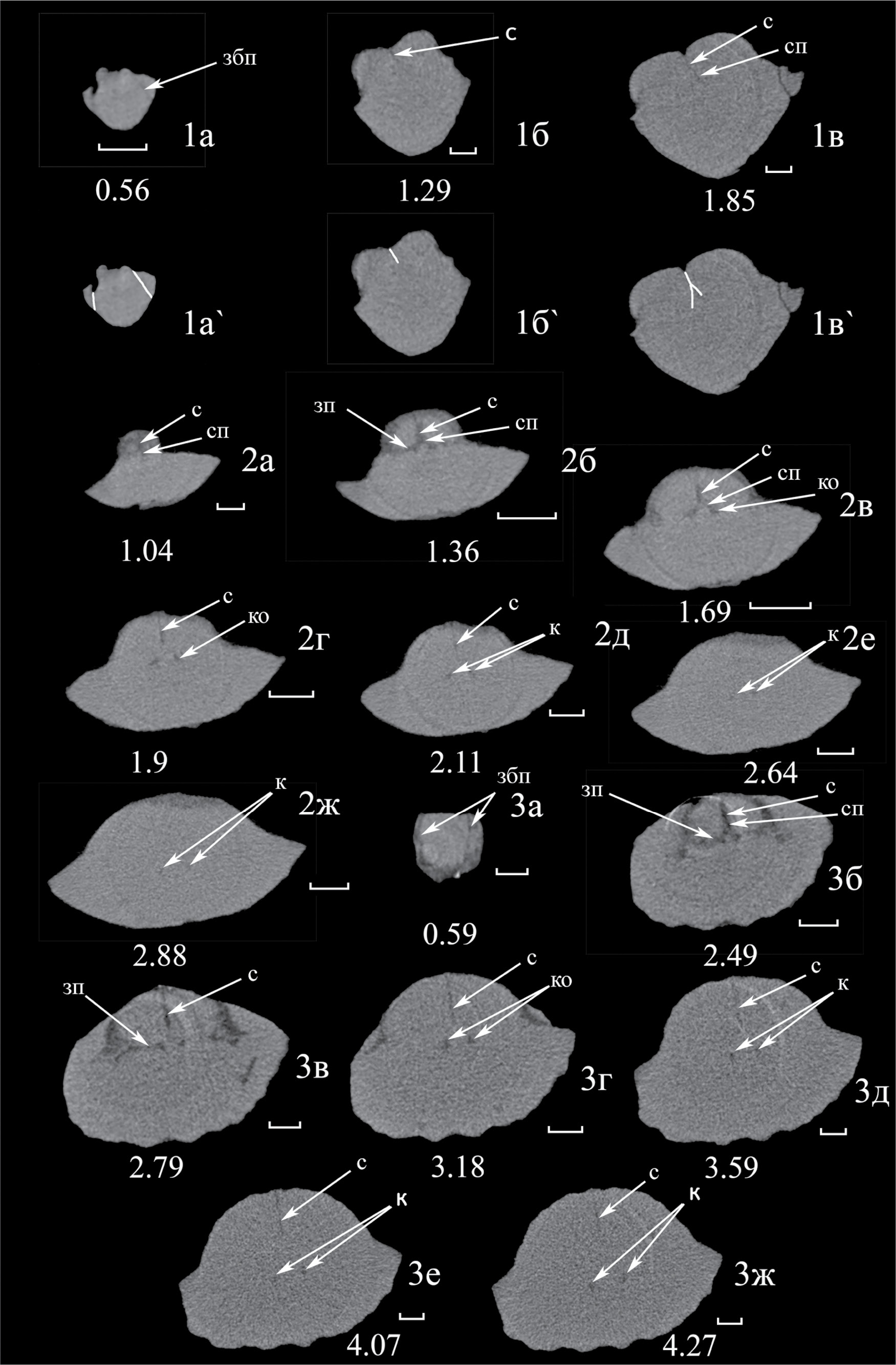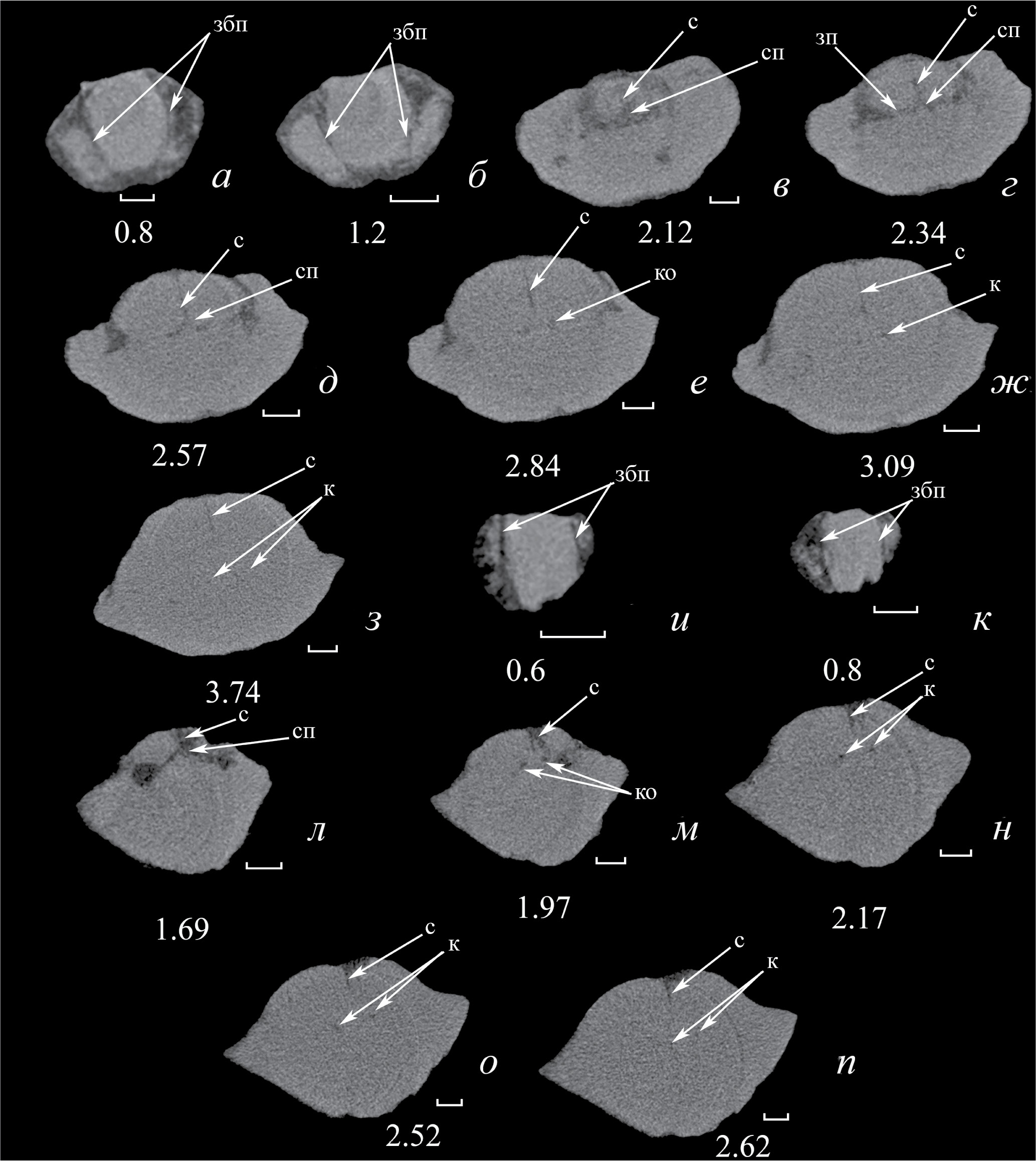 Рис. 1. Виртуальные поперечные срезы раковин Orbiculatisinurostrum kiselicum (Nalivkin, 1979): а–з – паратип ЦНИГР музей, № 3085/540; и–п – паратип ЦНИГР музей, № 3085/538; Урал, берег р. Ряузяк; верхний девон, верхний фамен, лытвенский горизонт. Обозначения: збп – зубные пластины, зп – замочная пластина, к – круры, ко – круральные основания, с – септа, сп – септалий. Масштаб – 1 мм. Рядом с каждым срезом стоит число, соответствующее его расстоянию от макушки брюшной створки. Круговые элементы на срезах – артефакты вращения; не являются морфологическими структурами раковин.