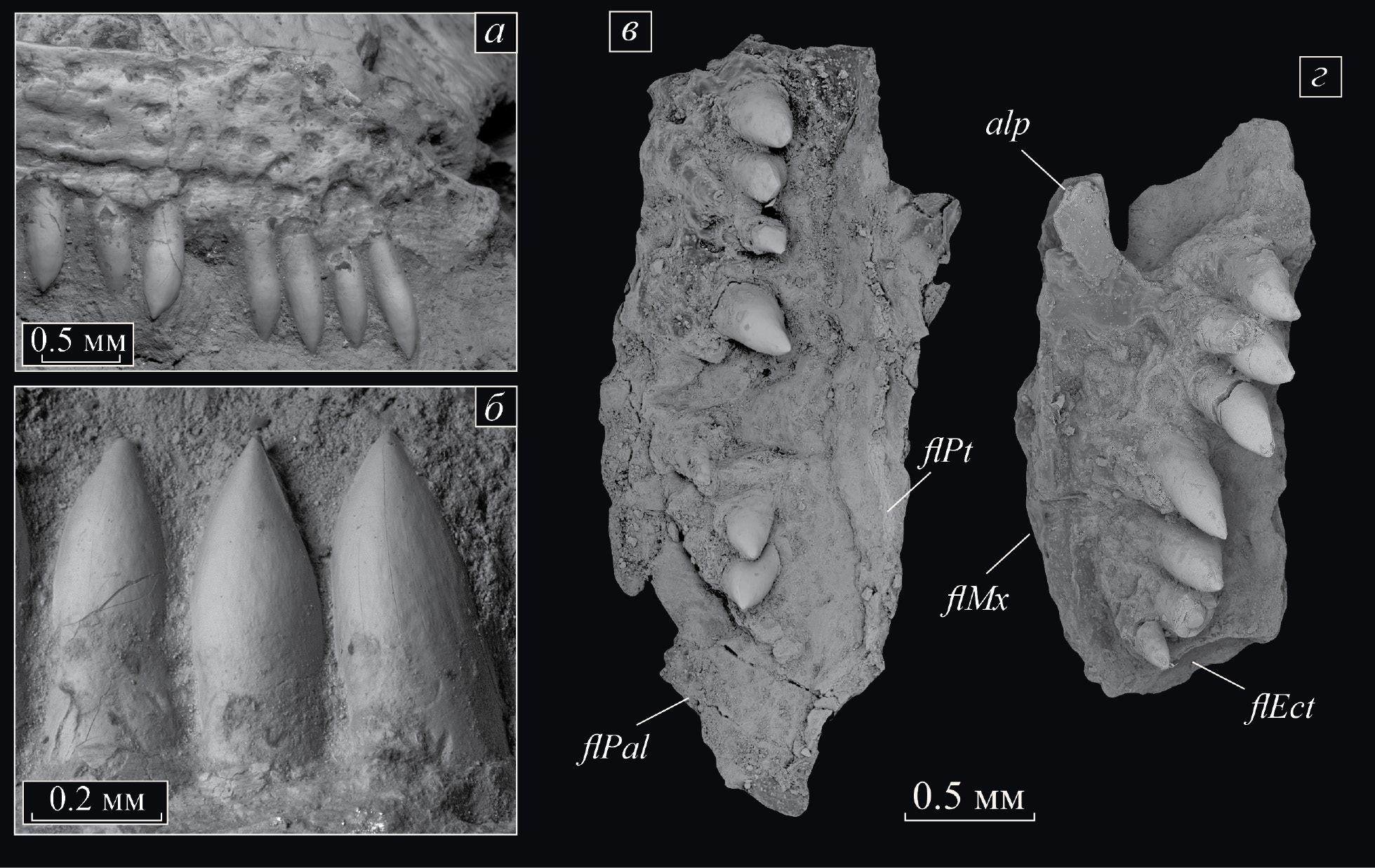 Ряд зубов, по размеру сопоставимых с челюстными, протягивается диагонально через всю небную кость от ее антеромедиального края, где она контактировала с vomer, через центр окостенения в направлении ее постеролатеральной оконечности. В передней части palatinum зубной ряд прямой, сильно дистанцирован от границы с максиллой и, при отсутствии вакантных позиций, содержит восемь зубов. Примечательно, что второй и последний зубы имеют меньший размер и вплотную примыкают латерально к более крупным соседним зубам (рис. 5, д, и; 6, г), что, в совокупности с небольшим размером, может являться указанием на их принадлежность предшествующей генерации. Это позволяет предполагать, что, в отличие от зубов маргинального комплекса, формирование новых крупных зубов на небных элементах не всегда сопровождалось утерей их предшественников. В целом, зубы, размещенные на palatinum, крупнее и слабее варьируют по высоте в сравнении с таковыми на vomer; при этом самые крупные зубы также приурочены к центральной части окостенения. Второй (небольшой) и предпоследний (шестой) зубы обломаны на уровне основания коронки; четвертый и пятый зубы разделены небольшой диастемой. Как и на vomer, мелкие “шагреневые” зубы на palatinum отсутствуют.