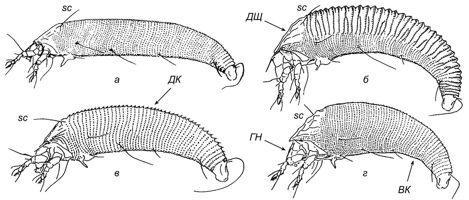 Рисунок 1. Равнокольчатые (а, в) и разнокольчатые (б, г) формы галловых клещей семейства Eriophyidae, различающиеся по окольцовке опистосомы и направлению скапулярных щетинок. а – Aceria tulipae K. (триба Aceriini), б – Aculus rhamnivagrans (K.) (триба Anthocoptini), в – Eriophyes breechii K. (триба Eriophyini), г – Phyllocoptes adalius K. (триба Phyllocoptini). Обозначения: ВК – вентральные кольца опистосомы, ГН – гнатосома (ротовой аппарат), ДК – дорзальные кольца опистосомы, ДЩ – дорзальный щиток, sc – скапулярная щетинка.