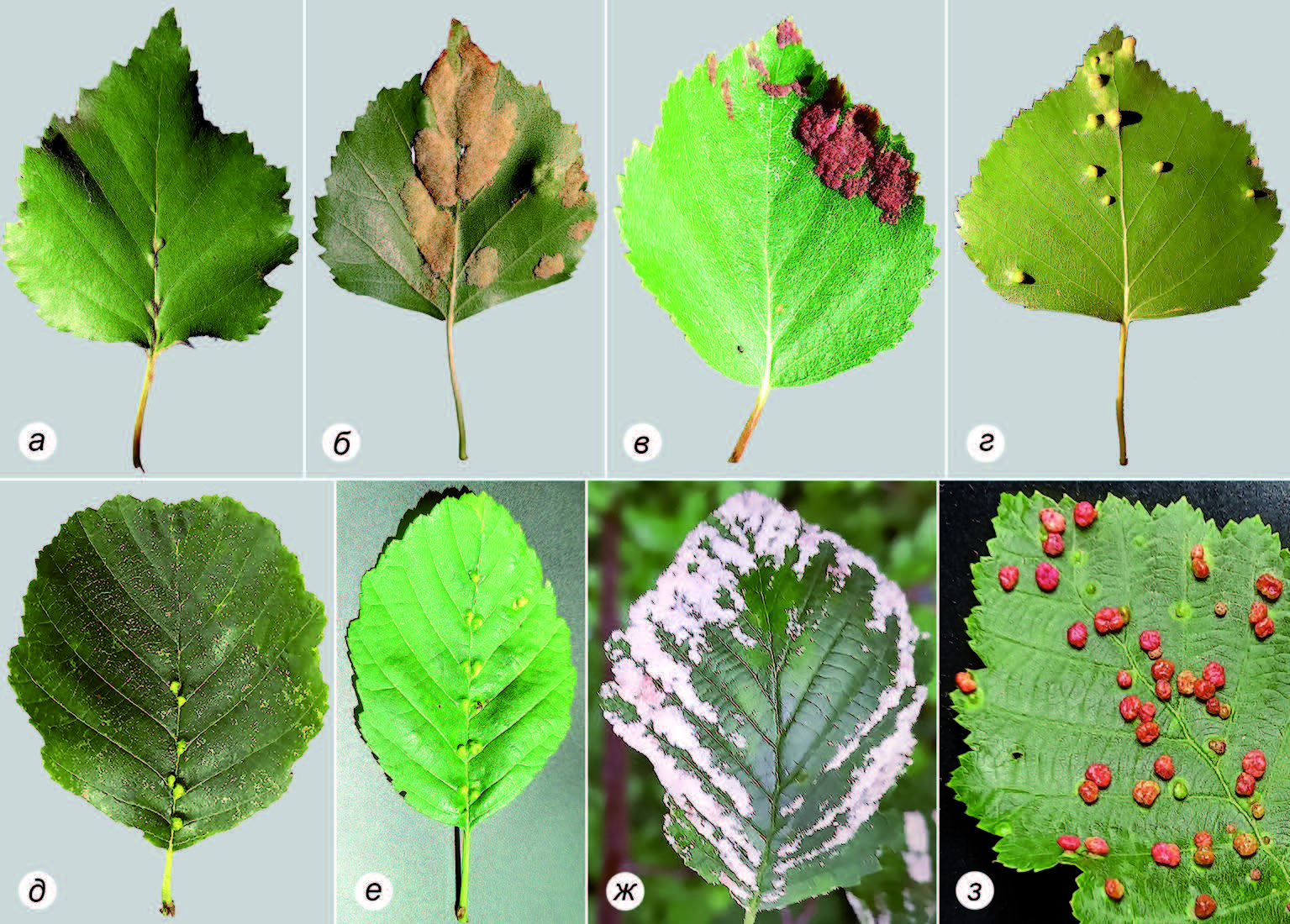 Рисунок 2. Галлы эриофиоидных клещей родов Eriophyes (а, г, д, е, з) и Acalitus (б, в, ж) на березе Betula pendula (а–г), ольхе черной Alnus glutinosа (д) и ольхе серой A. incana (е–з): уголковые галлы (а, е, ж), войлочки (б, в, з) и бляшковидные галлы (г, и). Фото – Ф.Е. Четвериков.