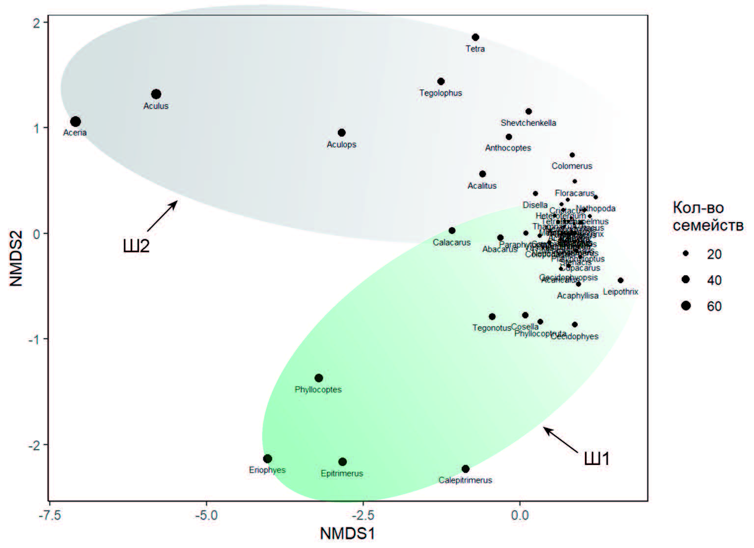 Рисунок 4. Визуализация результатов статистического анализа гостальных связей галловых клещей семейства Eriophyidae (многомерное шкалирование, минимальное искажение визуализации относительно исходной матрицы расстояний, Stress = 0.103). Положение родов галловых клещей отмечено черными кружками. Диаметр кружка отражает число семейств растений-хозяев, с которыми связаны клещи данного рода. Два шлейфа показаны зеленым (Ш1) и серым (Ш2) градиентом.