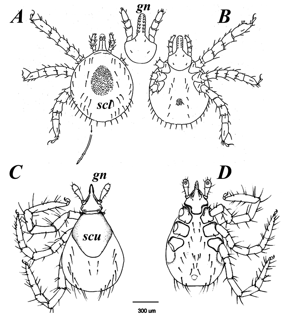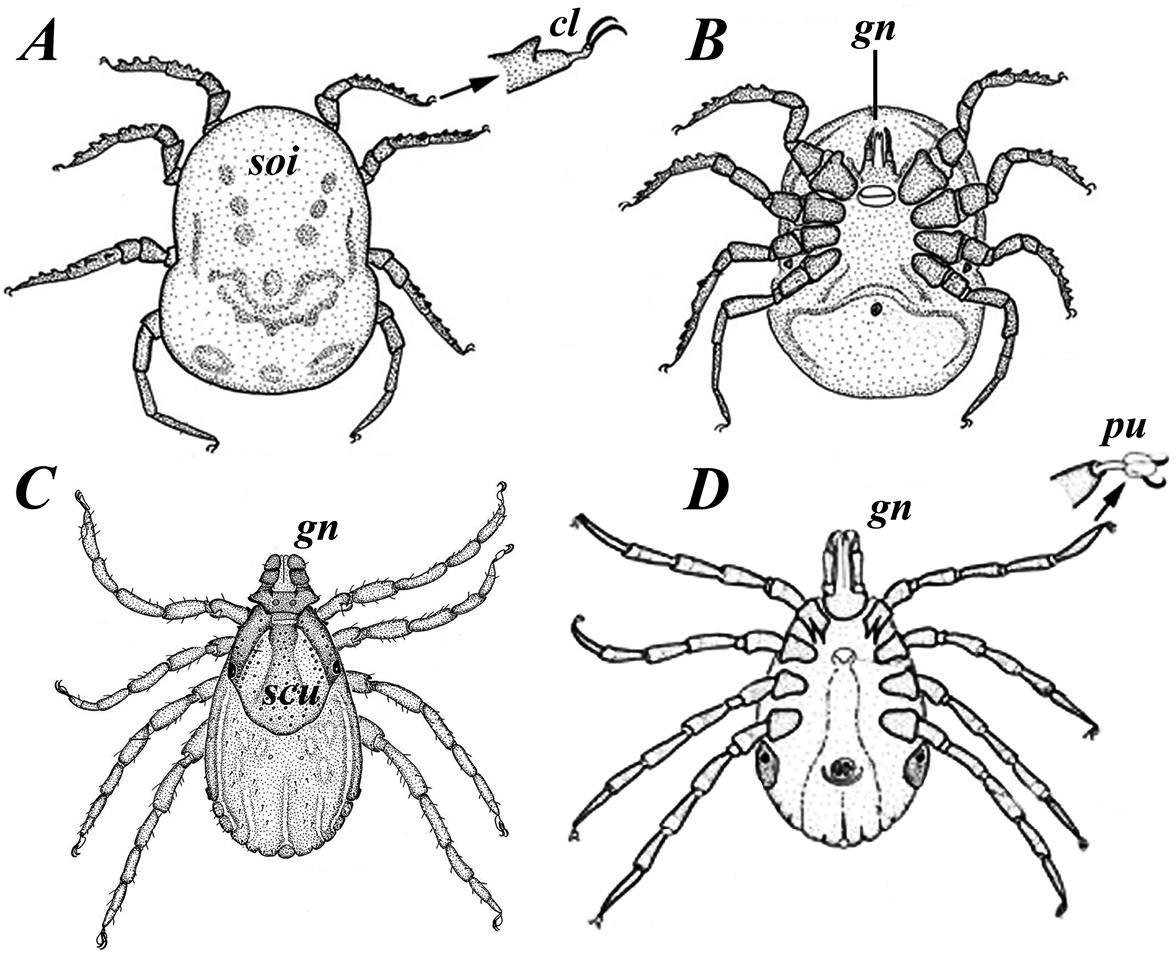 Figure 1. The main morphological characters of ticks: (A–B) soft ticks, with an example of the genus Ornithodoros (А – dorsal view, B – ventral view) and (С–D) hard ticks, with an example of a female of the genus Hyalomma (C – dorsal view, В – ventral view). From Barker, Walker, 2014. Designations: (gn) gnathosoma; (scu) scutum; (cl) claw; (soi) soft idiosoma; (pu) pulvillus.