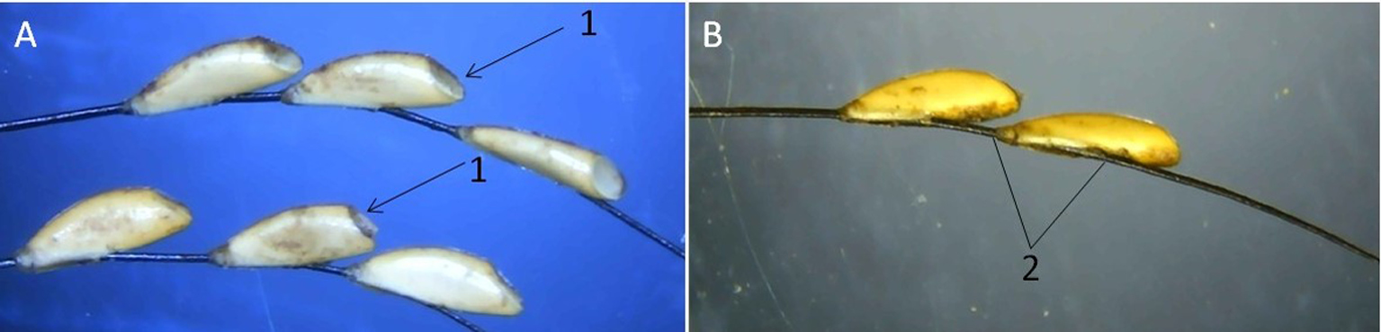 Рисунок 1. G. intestinalis, яйца на волосяных стержнях: A – высокая интенсивность инвазии домашней лошади. Стрелками указаны крышечки яиц (1); B – пластины прикрепительного придатка (2) охватывают волосяной стержень частично.