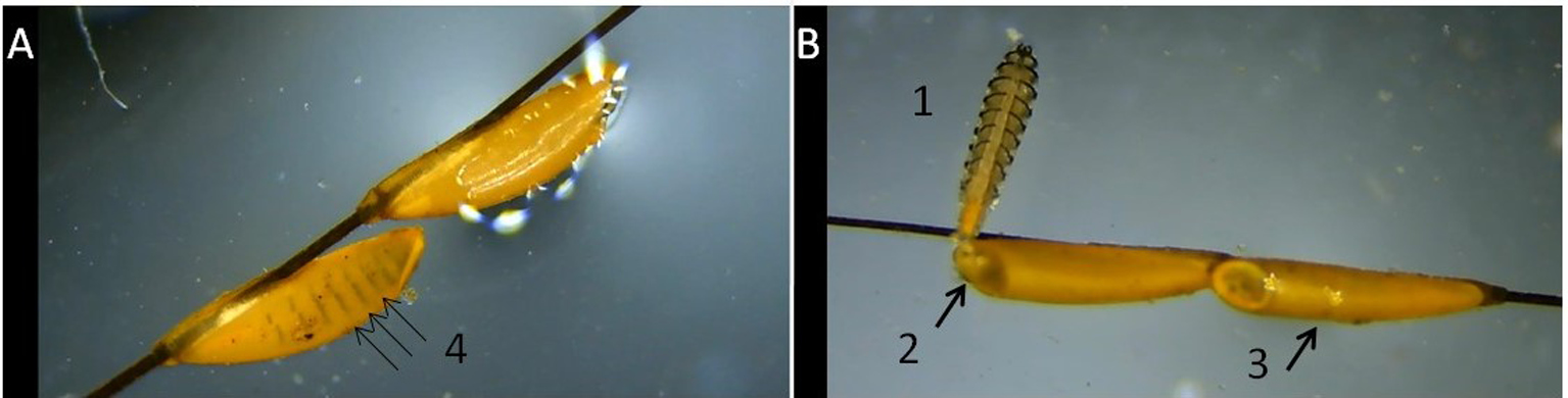 Рисунок 2. G. intestinalis, выход из яйца личинки 1-й стадии развития: A – через увлажненную оболочку яйца видна подвижная членистая личинка. Стрелками указаны ряды шипов (4). Псевдоцефал направлен в сторону крышечки; B – выход личинки 1-й стадии развития (1) после открытия крышечки (2). Соседняя личинка находится в яйце (3).