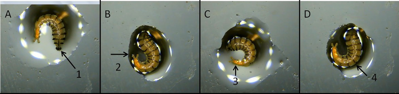 Figure 3. G. intestinalis, extraordinary mobility of the larva of the 1st stage of development. A – oral hooks and the first dorsal segment armed with spikes (1); B – the tracheal trunks and posterior spiracles protrude far beyond the last abdominal segment (2); С –‘red spot’ (3); D – rows of spikes on the segments of the larva (4).