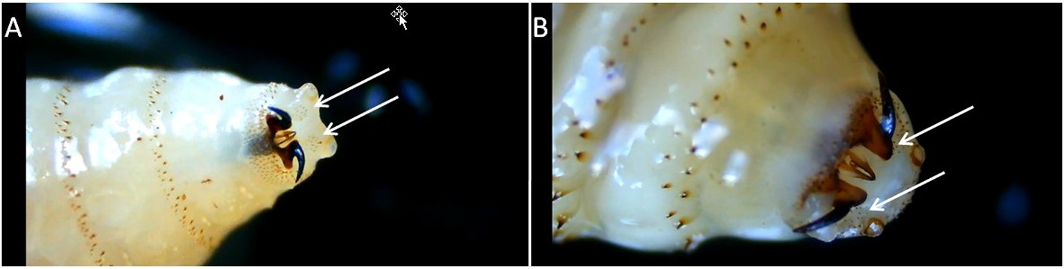 Figure 6. G. intestinalis, pseudocephalic larvae of the 3rd stage of development. Arrows point to sensory organs: A – view of the papillaes from below; B – view of the papillaes from above – the lateral surfaces are highly pigmented, and a pair of sensory organs on each papillae are clearly visible.