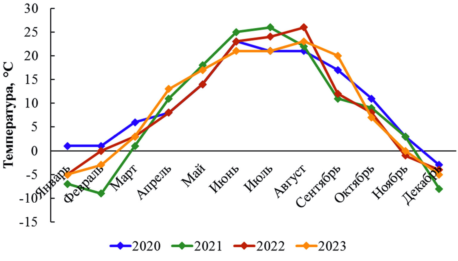 Figure 1. Dynamics of average air temperature in Tver Province for the period from 2020 to 2023 according to the data of meteorological Station № 563481 “Emmaus”