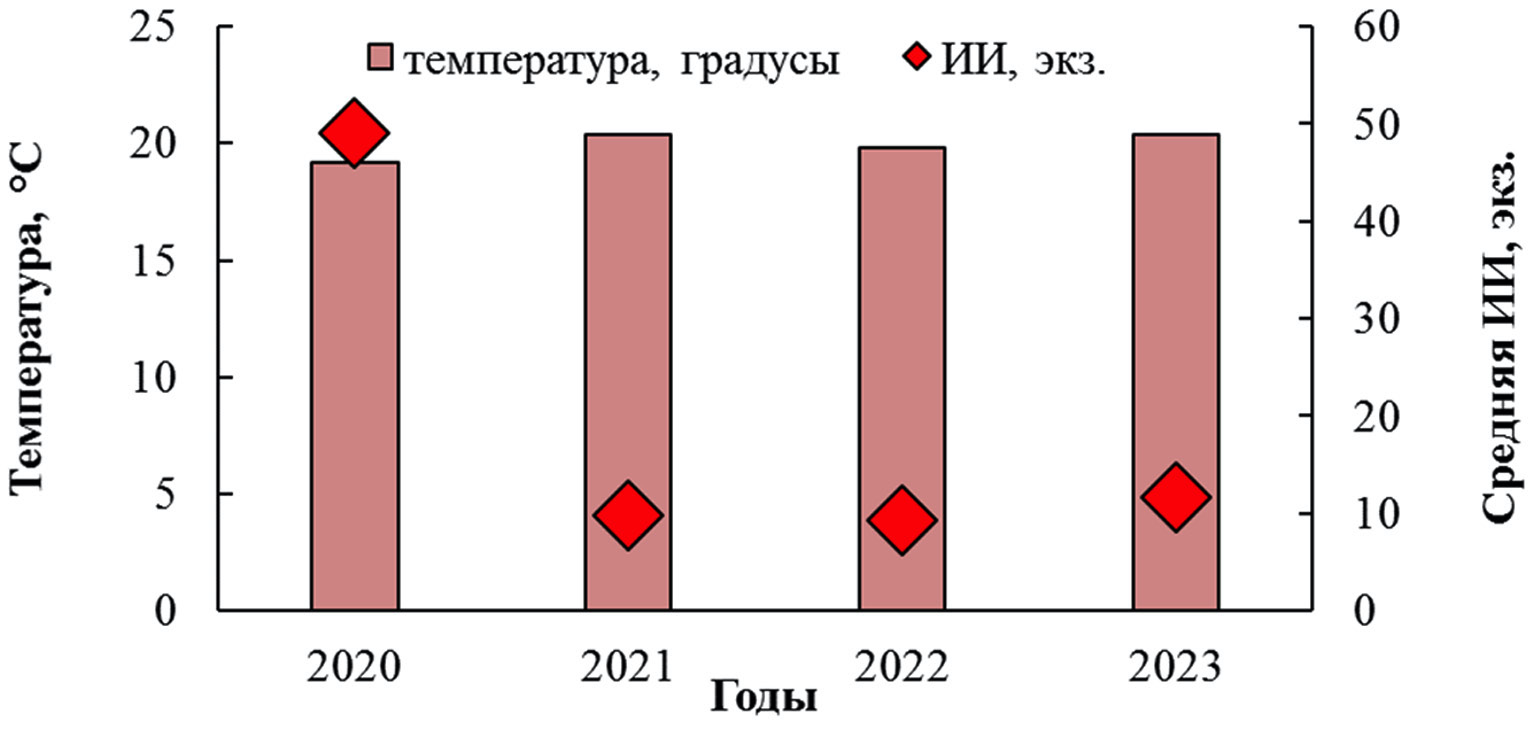 Средняя температура воздуха и средняя ИИ за период с мая по сентябрь в 2021, 2022 и 2023 годах примерно одинаковая и составляет 20.4°С и 9.8 экз., 19.8°С и 9.3 экз., 20.4°С и 11.7 экз. соответственно. Низкотемпературные зимние месяцы за три года сформировали динамику по ИИ эктопаразитов норок.