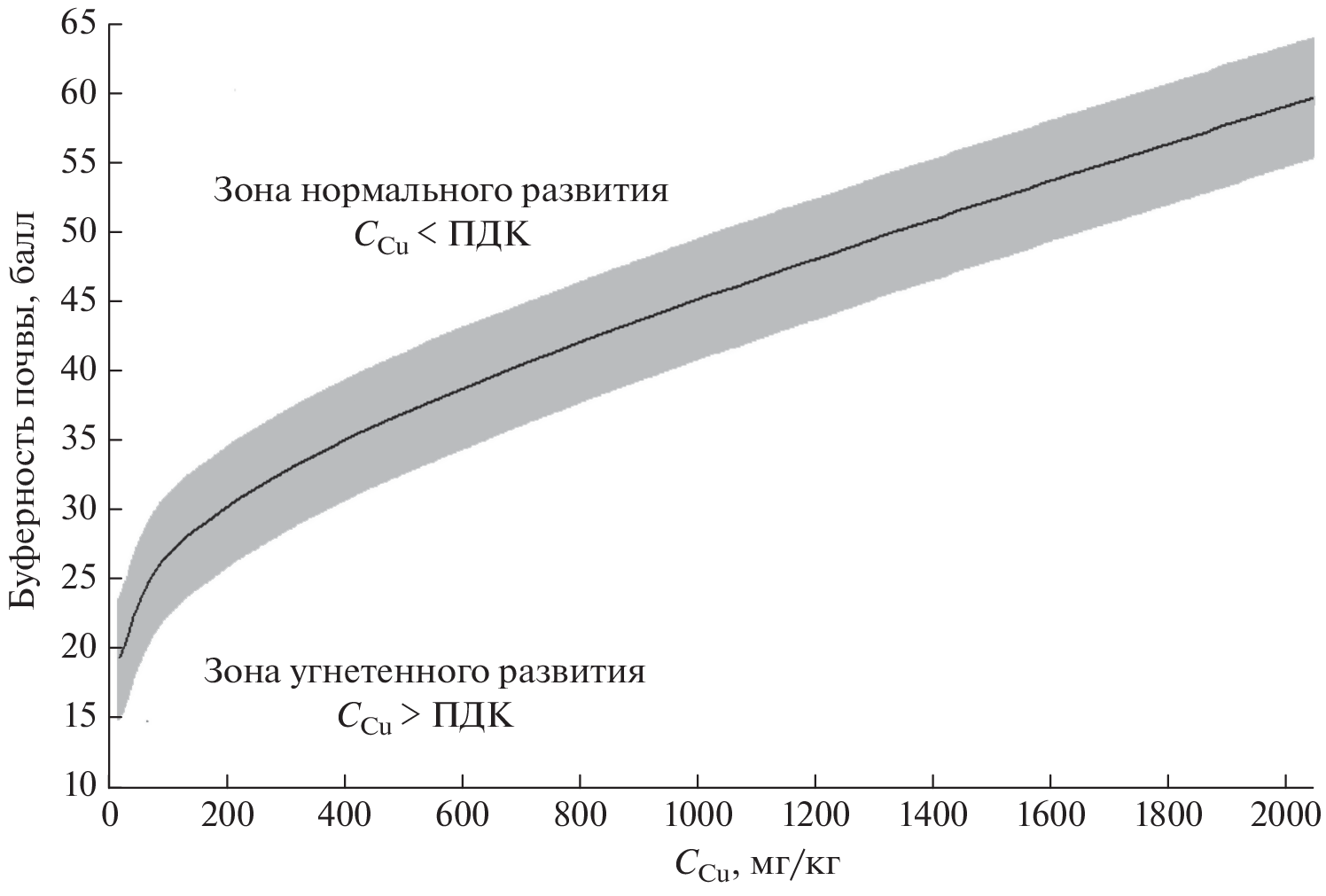 In a multifactorial vegetation experiment, the effect of the composition and properties of soils and soil-sandy substrates contaminated with various doses of copper acetate on the morphometric parameters of spring barley seedlings was studied. It has been shown that the germination and vigor of seed germination, as well as the length of roots, aboveground parts, and dry biomass of plants depend in a complex way on the concentration of Cu in soils and substrates, as well as their buffering capacity to heavy metals. The presence of two mechanisms of Cu influence on plant development was established: metabolic at СCu < 500 mg/kg of soil and diffusion at СCu > 500 mg/kg. Using methods of regression analysis on experimental data, a multiple regression equation was obtained that combines morphometric parameters of plants, concentration of Cu in the substrates, and the buffering capacity of soils to heavy metals. On its basis, in the coordinates of soil buffering capacity – Cu concentration, a curve of values f the maximum permissible concentration of Cu in soils in the concentration range from 17 to 2047 mg/kg. It makes the possibility to separate the zone of permissible development of barley plants (reduction of morphometric parameters by no more than 15%) from the zone of exceeding the accepted value of maximum permissible concentration of Cu. Thus, maximum permissible concentration of Cu is considered not as a fixed value, but as a function of Cu concentration, soil buffering capacity, and plant species.