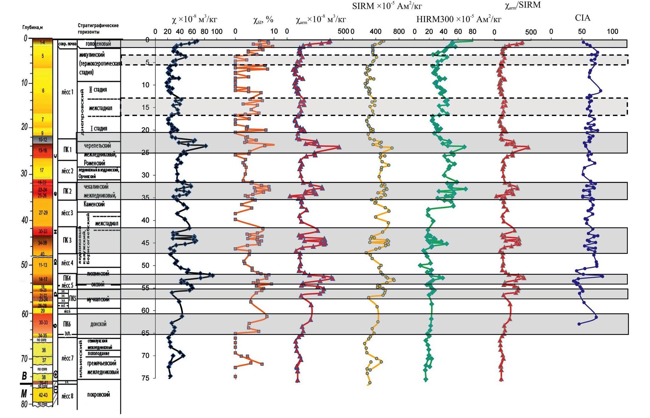 По магнитным параметрам, представленным на рис. 1, отмечается четкое различие палеопочвенных горизонтов и лёссов. По приросту величины магнитной восприимчивости изученные палеопочвы хорошо выделяются, что связано, в первую очередь, с биоклиматическим фактором формирования оксидов железа. Максимальные значения магнитной восприимчивости (χ) до 95 × 10⁻⁸ м³/кг характерны для ПК4 горизонтов, в то время как для отложений лёсса они составляют в среднем 20–25 × 10⁻⁸м³/кг. В нижней части разреза, к которой относится почвенный комплекс ПК6, фиксируется значение (χ) до 50 × 10⁻⁸ м³/кг. Значения χ около 65 × 10⁻⁸ м³/кг отмечаются для отложений каменского педокомплекса ПК3, который образовался в период калужского похолодания. Выше по разрезу располагаются отложения черепетьевского (роменского) межледниковья с мезенским почвенным комплексом ПК1 с (χ) до 82 × 10⁻⁸ м³/кг. Также на профильной кривой магнитной восприимчивости уверено выделяются микулинское межледниковье (MIS5) и межстадиал днепровского ледникового горизонта (MIS6). К последнему относится слабовыраженная брянская палеопочва, которая была выделена на глубине 13–8–14.5 м сотрудниками Института географии РАН при описании кернов [22]. Вариабельность магнитной восприимчивости отражает в первую очередь различие в содержании новообразованных магнитных железосодержащих минералов, являющихся результатом почвообразовательного процесса. Наблюдаемый прирост магнитной восприимчивости связан с зависимым от климата образованием и накоплением в почвенных горизонтах в первую очередь магнетита и маггемита. Этот факт подтверждается анализом данных, полученных с помощью комплекса методов магнитной минералогии (SIRM, χARM, χARM/SIRM; IRM100/SIRM). Параметры магнитных характеристик позволяют отметить, что в палеопочвенных горизонтах возрастает содержание ферримагнетиков, вероятно, магнетита. В то же время содержание гематита (гетита), которое может быть оценено по приросту HIRM300, не фиксирует существенных приростов в почвенных горизонтах. В верхней части разреза до глубины ~40 м сложеной рыхлыми отложениями, в которых общая пористость составляет 40–45%, отмечается существенное увеличение просадочности лёссовых пород [22]. В этой части разреза также фиксируются повышенные значения для HIRM300, отражающего содержание высококоэрцитивных минералов (гематита + гетит) ~ 50 (10⁻⁵ – 10⁻⁵ Aм²/кг), в нижней части разреза до глубины 70 м значения уменьшаются до ~ 20 (10⁻⁵ – 10⁻⁵ Aм²/кг).