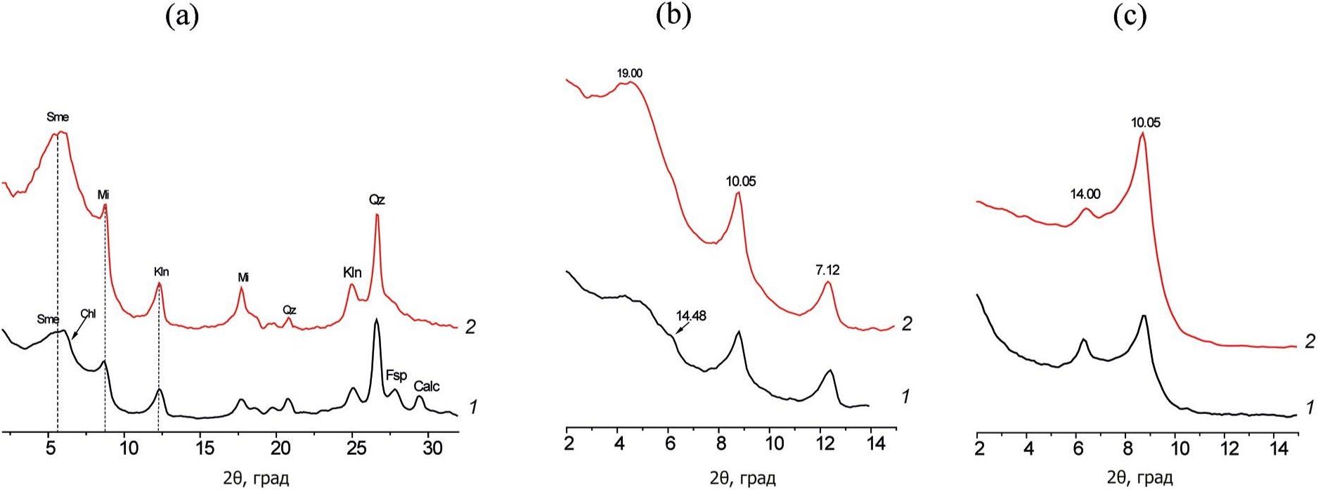 Рис. 4. Рентгендифрактограммы илистой фракции лёсса (1) и палеопочвы ПК4 (2): (a) Mg-форма, воздушно-сухие; (b) Mg-форма, насыщенные этиленгликолем; (c) Mg-форма, прокаленные при 550°C. Межплоскостные расстояния даны в Å. Сокращения: Sme – смектит, Mi – слюда, Kln – каолинит, Chl – хлорит, Qz – кварц, Fsp – полевой шпат, Calc – кальцит.