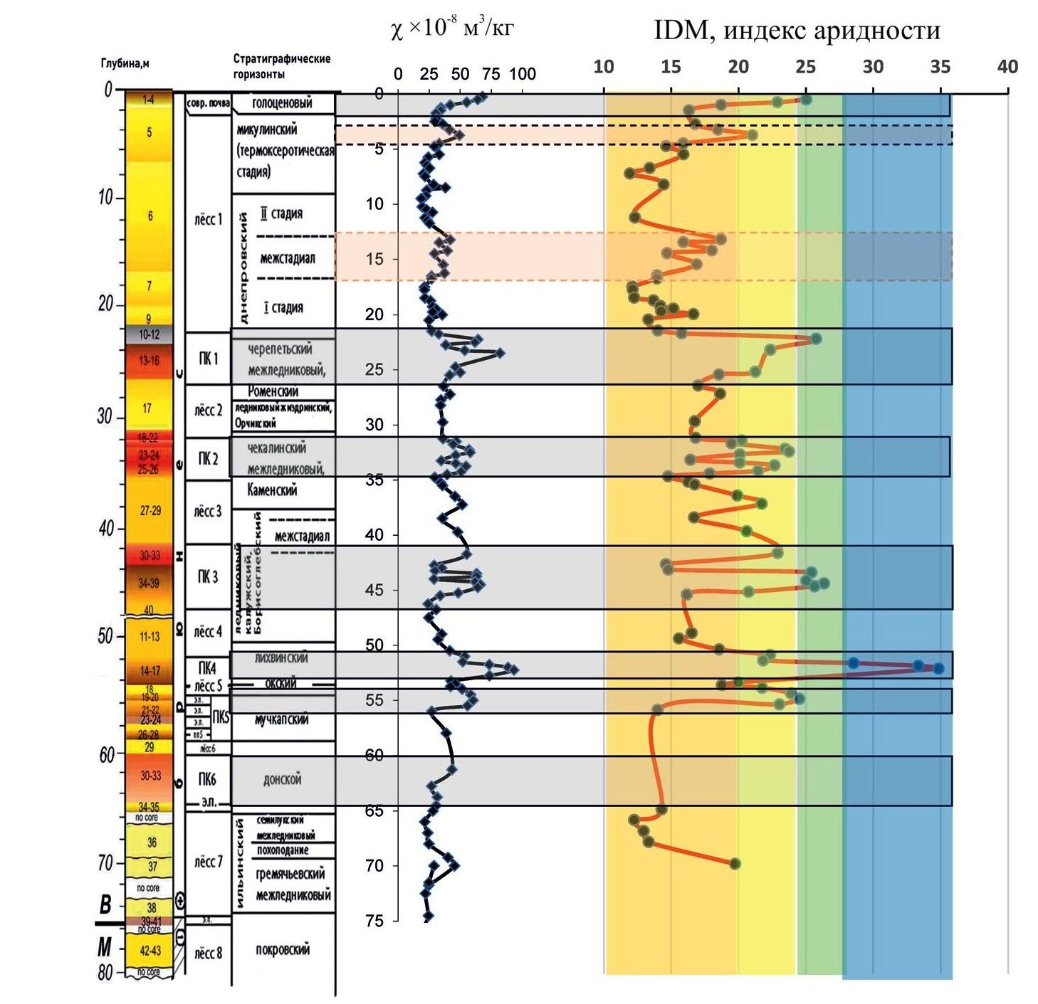 Содержание почвенного магнетита использовали как “магнитная запись” о предшествующих условиях окружающей среды степей, что позволило получать количественные реконструкции климата, а также количественно оценить сдвиг природных границ на протяжении позднего голоцена на юге Восточно-Европейской равнины, обусловленного климатическими вариациями [23, 24]. Статистический анализ климатических зависимостей изменения магнитной восприимчивости в современных почвах степей юга Восточно-Европейской равнины продемонстрировал, хотя и с определенными ограничениями, возможность определения количества атмосферных осадков, индекса аридности Де Мартона (IDM), коэффициента увлажненности (КU) в прошлые эпохи.