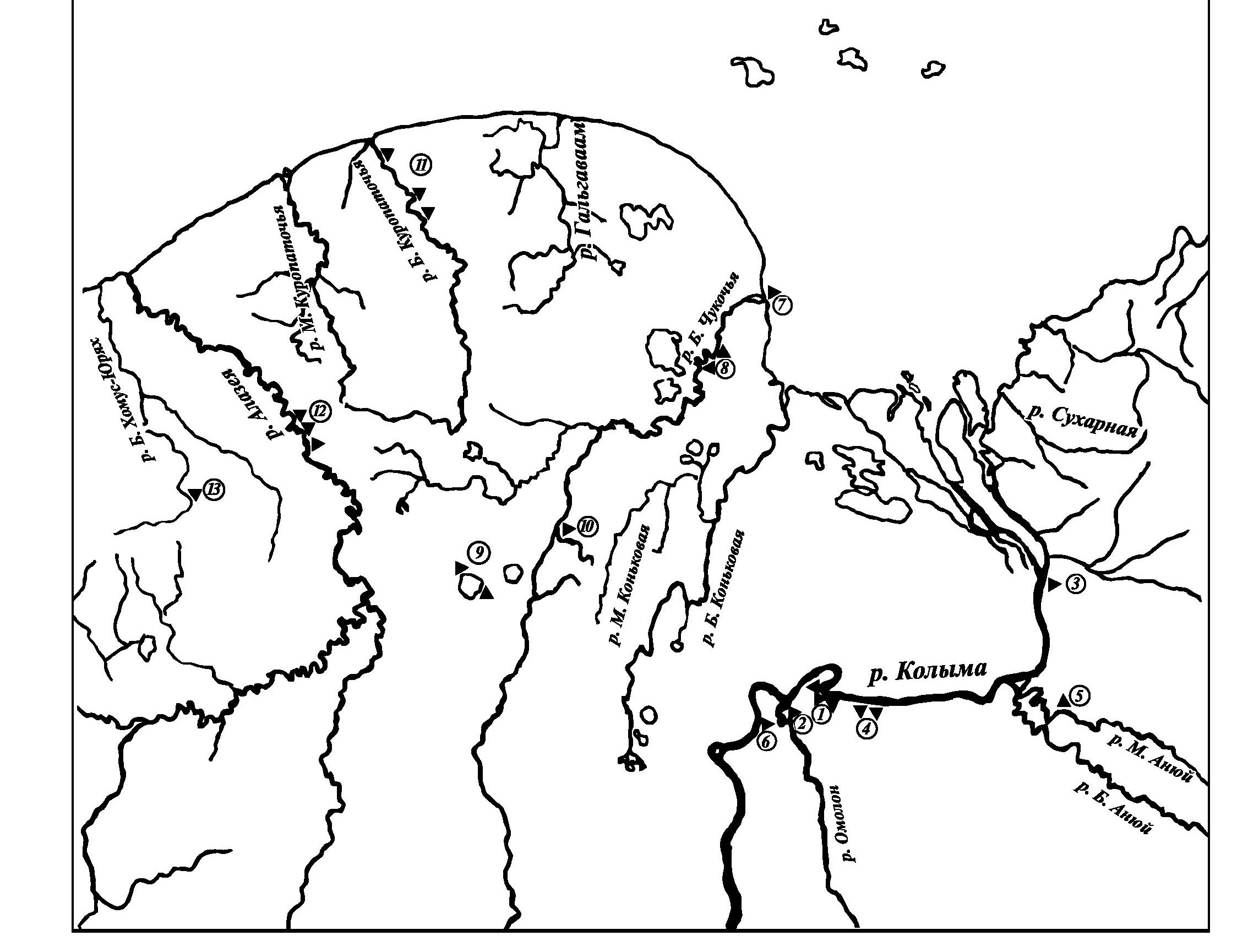 Рис. 1. Нахождение опорных позднеплейстоценовых разрезов. 1 – Дуванный яр, 2 – устье р. Омолон, 3 – Зеленый Мыс, 4 – виска Лакеевская, 5 – Станчиковский яр, 6 – р. Евсейка, 7 – мыс М. Чукочий, 8 – р. Б. Чукочья, 9 – озеро Б. Олер, 10 – виска Петку-Сян, 11 – р. Б. Куропаточья, 12 – р. Алазея, 13 – р. Б. Хомус-Юрях.