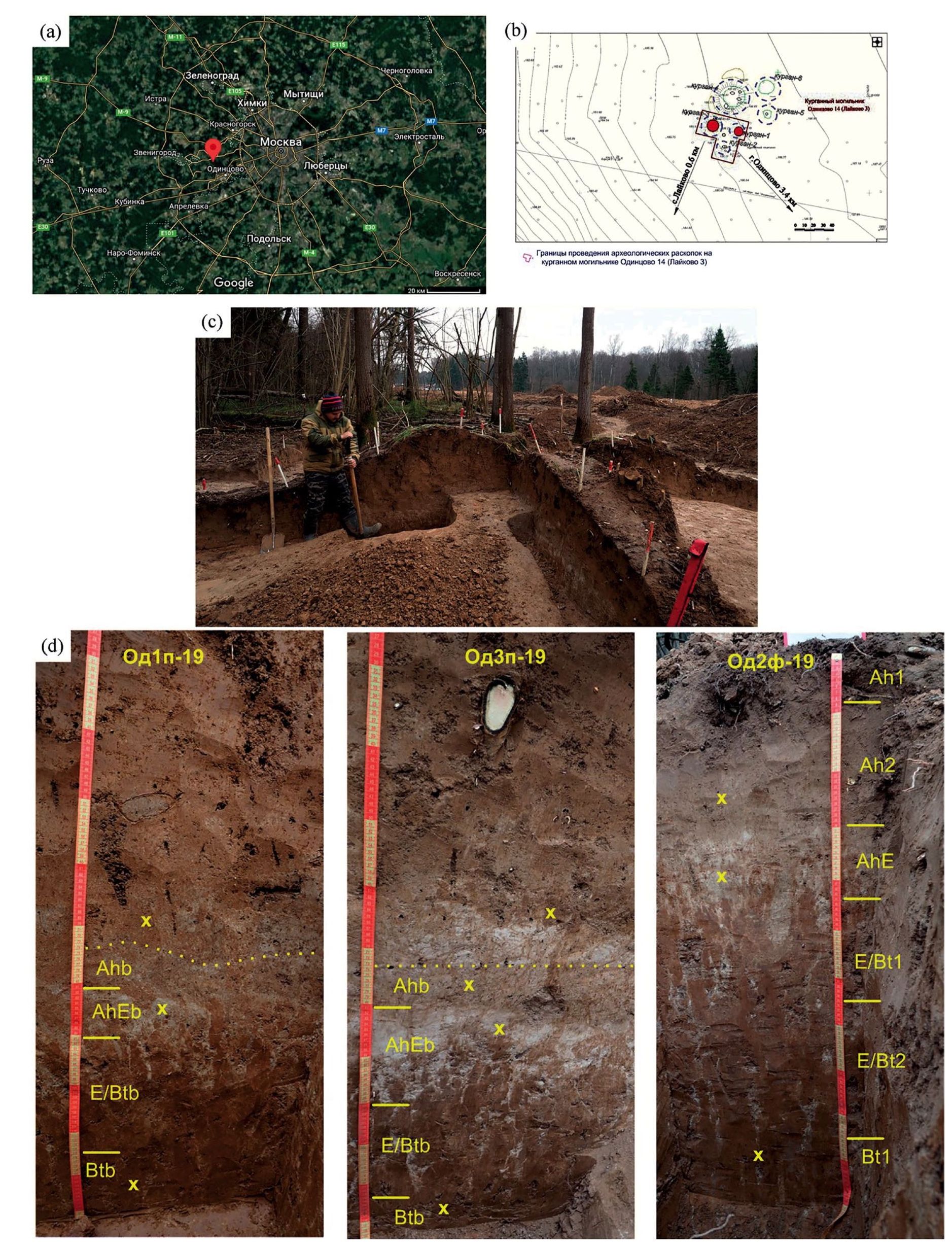 Исследования проводились в Одинцовском районе Московской области (рис. 1a) на территории курганного могильника Одинцово XIV (Лайково III) (рис. 1b) в рамках охранно-спасательных работ Института археологии РАН под руководством к. и.н А. В. Энговатовой. Могильник располагался в 1.3 км к северо-востоку от деревни Лайково, 100 м к северо-востоку от дорожного знака “7 км” на Красногорском шоссе, в 24 квадрате Подушкинского лесничества (55°42ʹ29.35ʺN и 37°12ʹ58.43ʹE) и включал семь курганов высотой 0.8–1.6 м, диаметром 6–17 м, со следами ровиков (рис. 1b, 1с). Согласно археологическим данным, курганы в могильнике сооружены представителями славянской культуры в XII–XIII вв. н. э.