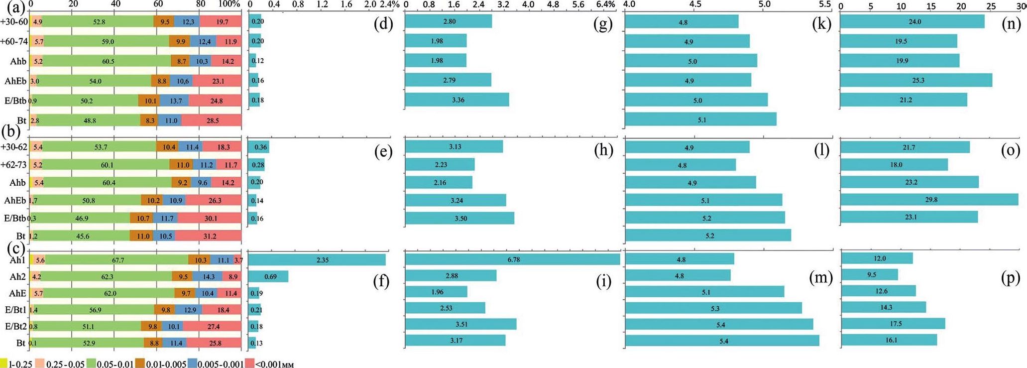 По гранулометрическому составу верхнего горизонта погребенные почвы среднесуглинистые иловато-мелкопылеватые (рис. 4a, 4b). Далее, начиная с горизонта AhEb, гранулометрический состав постепенно утяжеляется и становится тяжелосуглинистым, к нижним горизонтам даже переходя немного в градацию легкой глины, но с сохранением среди фракций преобладания ила и мелкой пыли. В современной почве лишь верхний горизонт сильно облегчен и по гранулометричесому составу относится к легкому суглинку (рис. 4c). Ниже по профилю гранулометрический состав современной и погребенных почв идентичны.