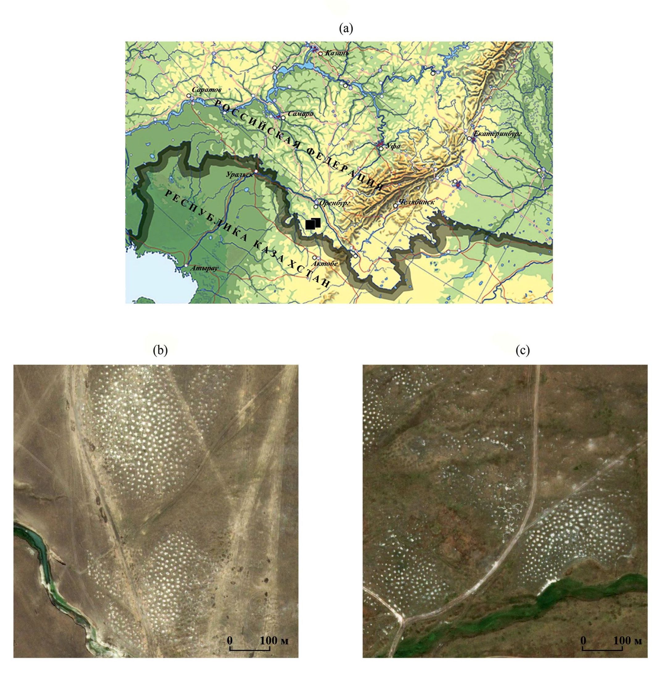 Особенностью Подуральского региона и всей Оренбургской области является распространение ареалов специфических ландшафтных комплексов, состоящих из упорядоченных бугров пучения [42]. Бугры пучения встречаются на глинистых и меловых породах, в случае последних было предложено название “меловые полигоны” [34]. Они представляют сочетание микроповышений, разделенных ложбинообразными микропонижениями. Вершины бугров представлены незадернованными меловыми пятнами, разбитыми на сегменты узкими полосами с растительностью. Микропонижения образуют полигональную сеть и характеризуются густым растительным покровом. Высота микроповышений в основном колеблется от 10 до 30 см, расстояние между центрами соседних микроповышений около 5–6 м.
