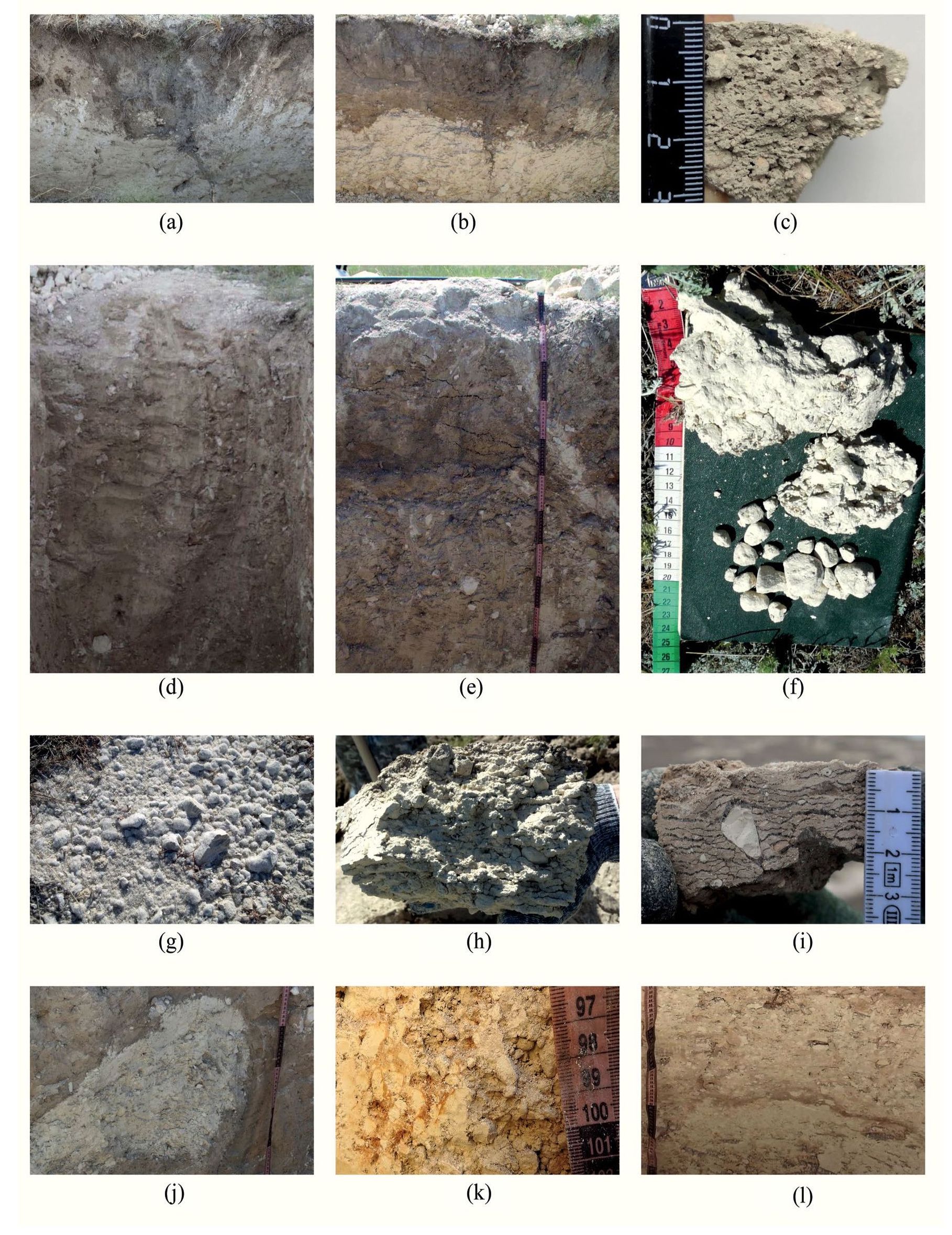 Рис. 4. Некоторые морфологические признаки почв меловых полигонов: двухъярусные клиновидные тела на задней стенке траншеи ОР2018–1 (a) и ОР2019–1 (b); меловая корка (c); вертикально ориентированный морфон (d); интрузивные внедрения мелового материала на боковой стенке (e); сочетание меловой муки и твердых меловых включений различного размера и степени окатанности в интрузиях (f); солевой налет на поверхности мелового пятна (g); постшлировая структура с окатанными меловыми включениями горизонта В2 (h); криотекстура горизонта В1 с вертикально ориентированным крупноземом с ледяной каймой (i); темные изогнутые морфоны по трещинам на границе BM1 и BM2 (j); пропиточные пятна ожелезненной меловой муки горизонта ВМ² (k); темная измятая полоса в нижней части профиля (l).