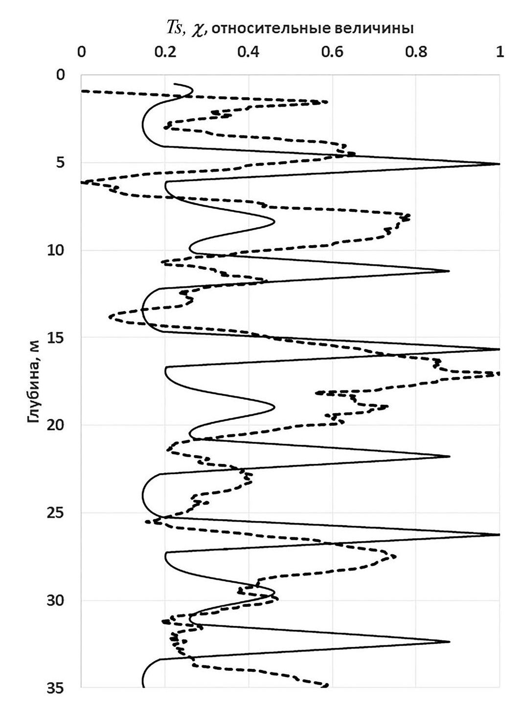 Рис. 4. Вычисленные значения степени трансформации осадка при почвообразовании (Ts, сплошная кривая) и измеренные сглаженные нормированные величины удельной магнитной восприимчивости (χ, пунктир).