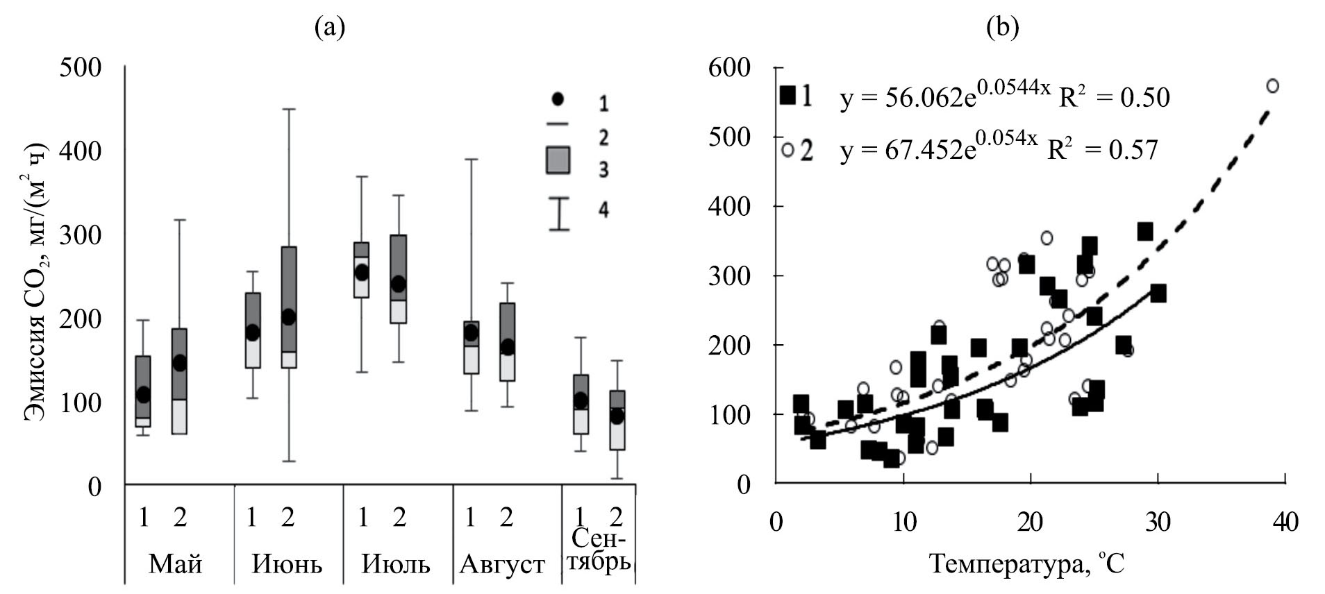 Рис. 3. Средняя месячная эмиссия CO₂ за десятилетний период: 1 – среднее, 2 – медиана, 3 – 25–75%, 4 – минимум (a); связь между эмиссией CO₂ и температурой воздуха на исследуемых торфяных почвах: 1 – залесенное болото, 2 – открытое болото (b).