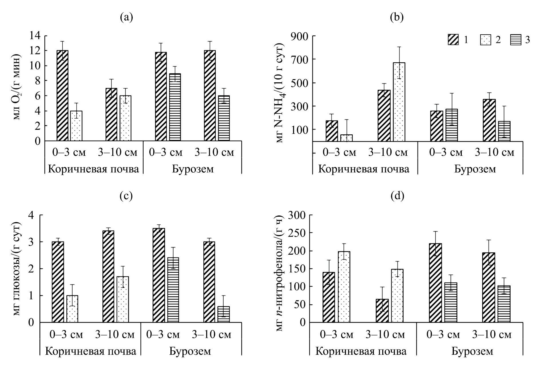 Рис. 2. Активность каталазы (а), уреазы (b), инвертазы (c), фосфатазы (d) коричневых почв и бурозема из слоев 0–3 и 3–10 см: 1 – контроль, 2 – постпирогенная коричневая почва, 3 – постпирогенный бурозем.
