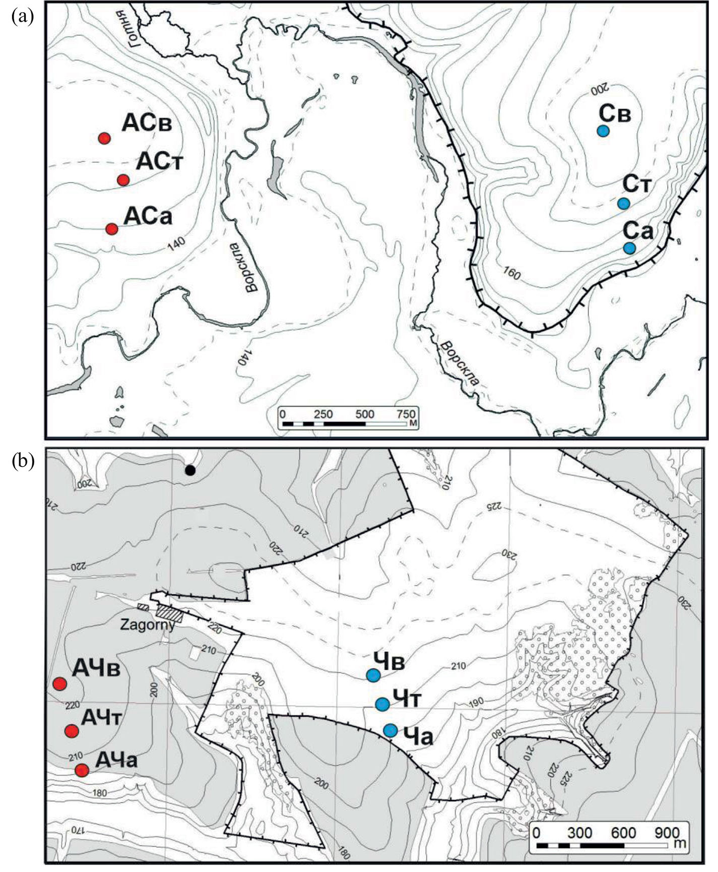Рис. 1. Точки отбора почвенных образцов: a – ключевой участок “Лес на Ворскле”; b – ключевой участок “Ямская степь”; С – серые целинные. АС – агросерые, Ч – черноземы целинные, АЧ – агрочерноземы. Малые индексы: в – водораздел, т – транзитная зона, а – аккумулятивная зона.
