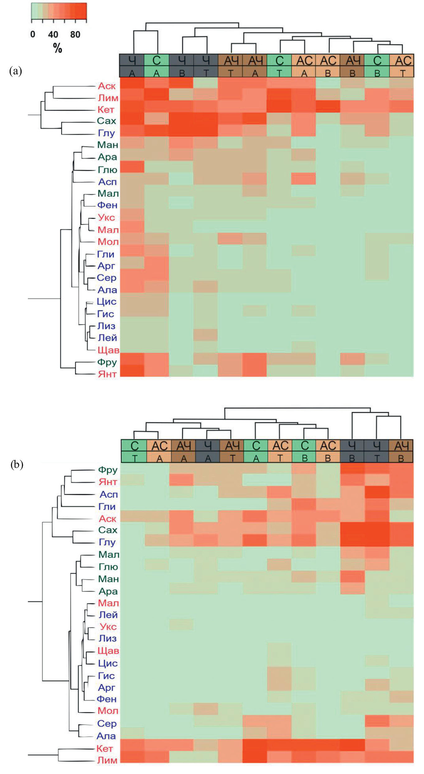 Рис. 3. Кластеризованная тепловая карта метаболического разнообразия микробных сообществ целинных и пахотных почв. a – слой 0–10 см, b – слой 10–20 см. По вертикали синим цветом обозначены аминокислоты, красным – карбоновые кислоты, зеленым – углеводы. По горизонтали показана кластеризация целинных и пахотных почв. Условные обозначения: С – серая целинная, АС – агросерая, Ч – чернозем целинный, АЧ – агрочернозем. Малые индексы: в – водораздел, т – транзитная зона, а – аккумулятивная зона.