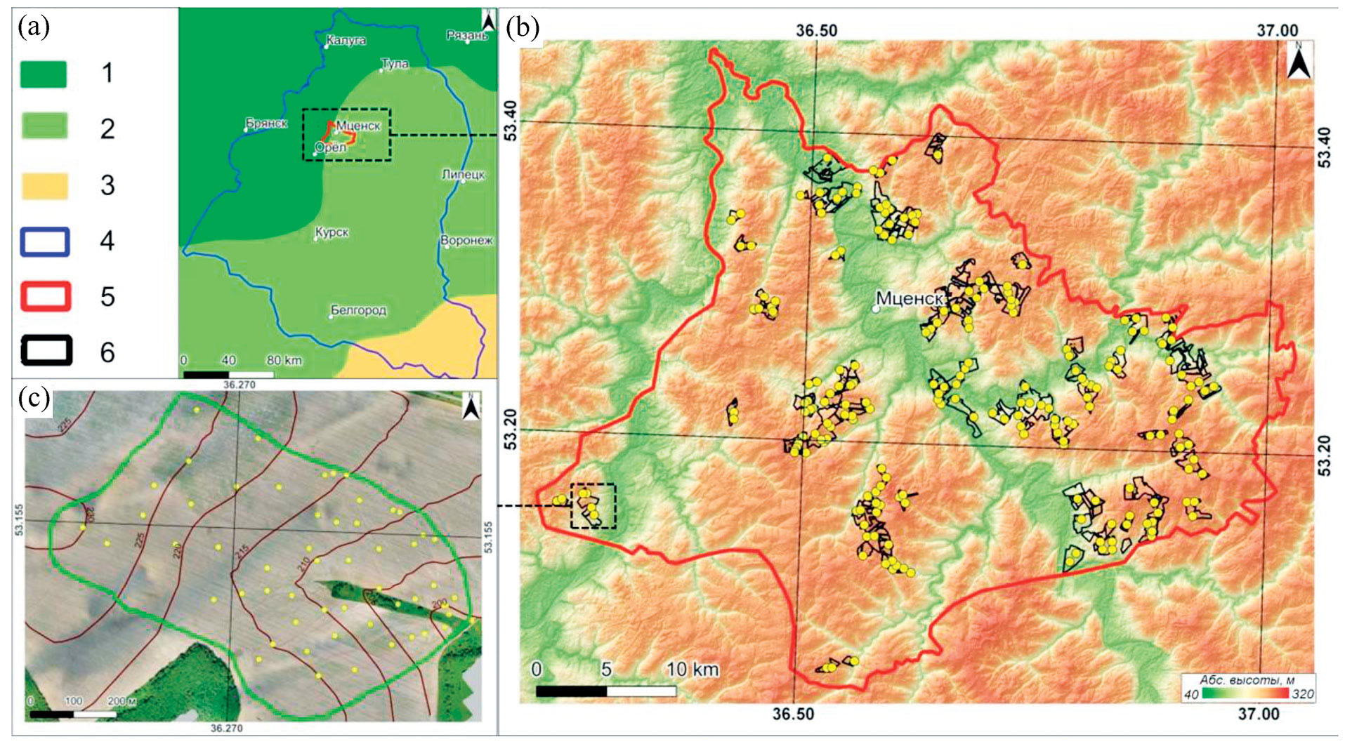 Рис. 1. Положение и рельеф участков исследования с точками опробования почв: a – участок “Мценский” (природно-климатические зоны: 1 – лесная, 2 – лесостепная, 3 – степная; 4 – границы Среднерусской возвышенности); b – участок “Мценский” (границы: 5 – участка, 6 – полей); c – участок “Ломовец” (границы водосбора обозначены зеленым цветом).