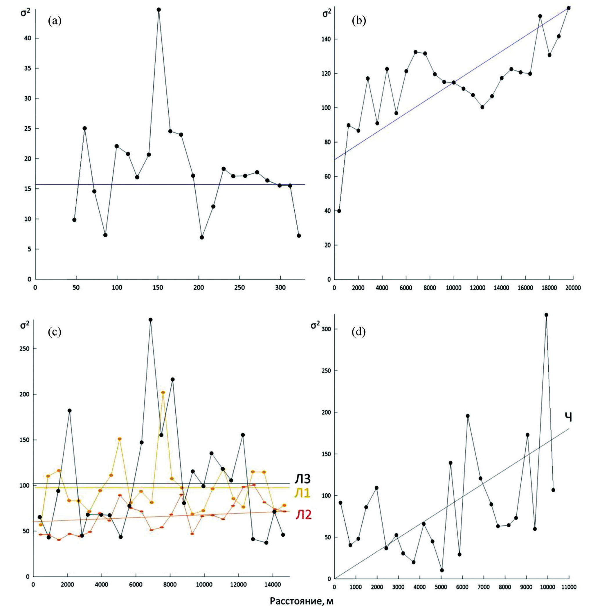 Рис. 4. Вариограммы эродируемости почв во всех точках обследования малого водосбора “Ломовец” (a); во всех точках обследования участка “Мценский” (b); в точках с серыми лесными почвами участка “Мценский” (c); в точках с черноземами участка “Мценский” (d).