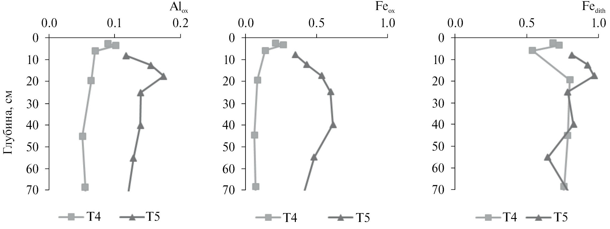 На участке Т6, для которого характерно застойное переувлажнение, в верхней части профиля формируется оторфованный иловато-перегнойный (Тmr) горизонт мощностью до 10–14 см. Ниже расположен пропитанный потечным гумусом горизонт С═g,hi, переходящий в бурый С═g с сизыми и ржавыми пятнами, подстилаемый насыщенным водой глеевым сизым горизонтом СG. В таких условиях ведущим процессом почвообразования становится торфонакопление. Анализ литературы [9, 24] показал, что скорость торфонакопления может достигать 1–3 мм/год. Сизые тона окраски минеральной толщи исследователи отмечают в переувлажненных почвах антропогенно трансформированных ландшафтов [44].