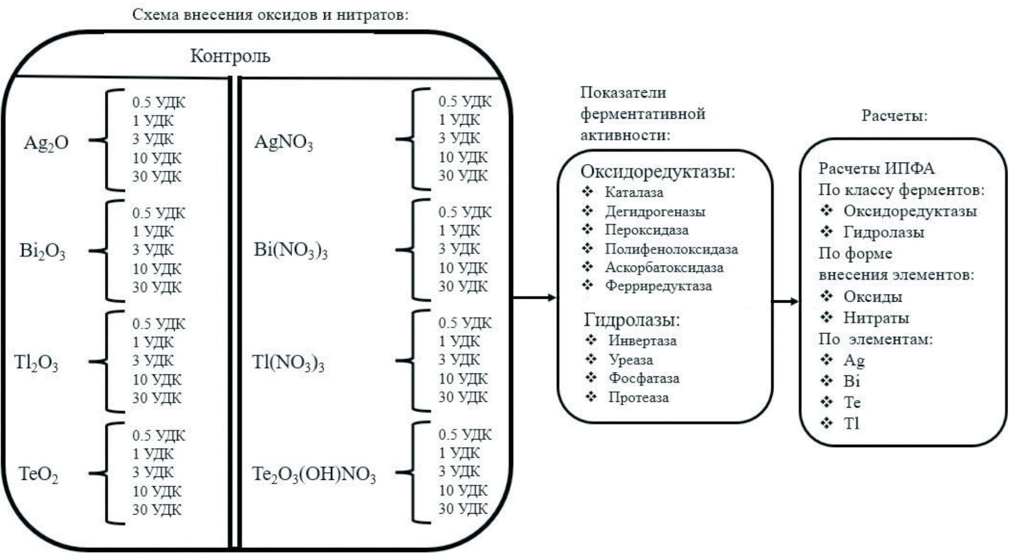 Исследования экологического состояния почв после антропогенных воздействий по широкому диапазону ферментов встречаются нечасто [7–11, 13, 38, 39]. Встречаются исследования, подтверждающие токсическое влияние Te и Tl на активность ферментов в различных живых системах [15, 18, 28, 42, 52]. В отличие от Ag изучению влияния Bi, Te, Tl на ферментативную активность почв уделяется ограниченное внимание, несмотря на актуальность данной проблемы. Существуют лишь единичные исследования, касающиеся изучения влияния Bi, Te и Tl на ферментативную активность почв [30, 33, 34, 41, 54]. Таким образом, актуальным представляется изучение вопроса, связанного с влиянием Ag, Bi, Te и Tl на ферментативную активность почв, в частности сравнение элементов между собой по степени экотоксичности.
