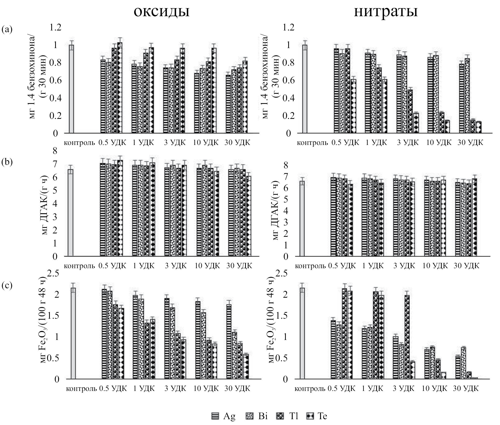 Изменение активности аскорбатоксидазы и ферриредуктазы при загрязнении чернозема обыкновенного оксидами и нитратами Ag, Bi, Tl и Te представлено на рис. 3b, 3c. Оксиды и нитраты Ag, Bi, Tl и Te при всех дозах загрязнения не оказывали достоверного воздействия на активность аскорбатоксидазы почвы относительно контроля. Активность ферриредуктазы чернозема при загрязнении оксидом серебра 0.5 и 1 УДК достоверно не отличалась от контроля. При повышении дозы от 3 до 30 УДК установлено ингибирование активности на 11–17% относительно контроля. Нитрат серебра уже при дозе 0.5 УДК ингибировал активность ферриредуктазы на 35%. С повышением концентрации от 1 до 30 УДК активность фермента была ингибирована на 44–75% относительно контроля соответственно.