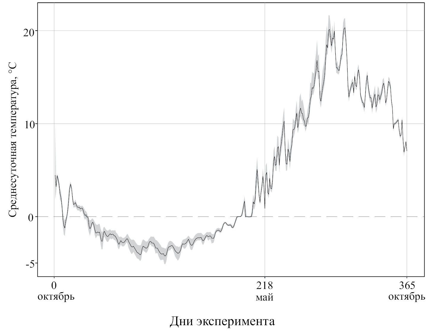 Рис. 1. Среднесуточные температуры лесной подстилки на глубине 3 см. Данные представлены средними величинами (n = 7), серое поле отображает минимальную и максимальную суточные температуры.