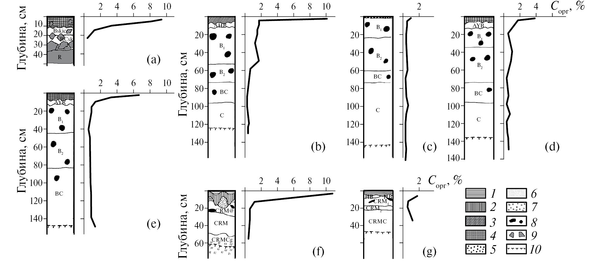 Были изучены почвы трех петрофитных и двух термофитных степоидов, расположенных на правом берегу р. Пантелеихи (правого притока Колымы) (рис. 1). Разрезы 4-08 и 8-12 характеризуют почвы петрофитных степоидов в верхней части крутых (32°–35°) склонов: первый из них в районе обнажения Малиновый яр (одного из двух степоидов), а второй – на 5 км выше по реке (Чеглок). Разрезы 601-08 и 35-85 вскрывают почвы термофитных степоидов: в районе Бубякинских дач и у подножья г. Родинки соответственно. В районе Бубякинских дач мощность рыхлых отложений едомной свиты превосходит 10 м, что известно по буровым данным. Почвы изучали на разных уровнях склона; разрез 601-08 располагается на перегибе, где пологий склон переходит в крутой, а 103-87 – на крутом участке склона. Разрез 35-85 был заложен в средней части крутого (30°) склона. Во всех случаях встречаются норы арктических сусликов (Urocitellus parryii) и полевок (Microtus sp.), на поверхности выражен зоогенный нанорельеф с перепадами высот 10–20 см. Параллельные исследования проводили в зональных биогеоценозах притундровых редколесий. Разрез 501-08 характеризует почву бруснично-зеленомошно-кустарникового лиственничного редколесья на пологом склоне южной экспозиции. Описания разрезов приводятся в табл. S1.