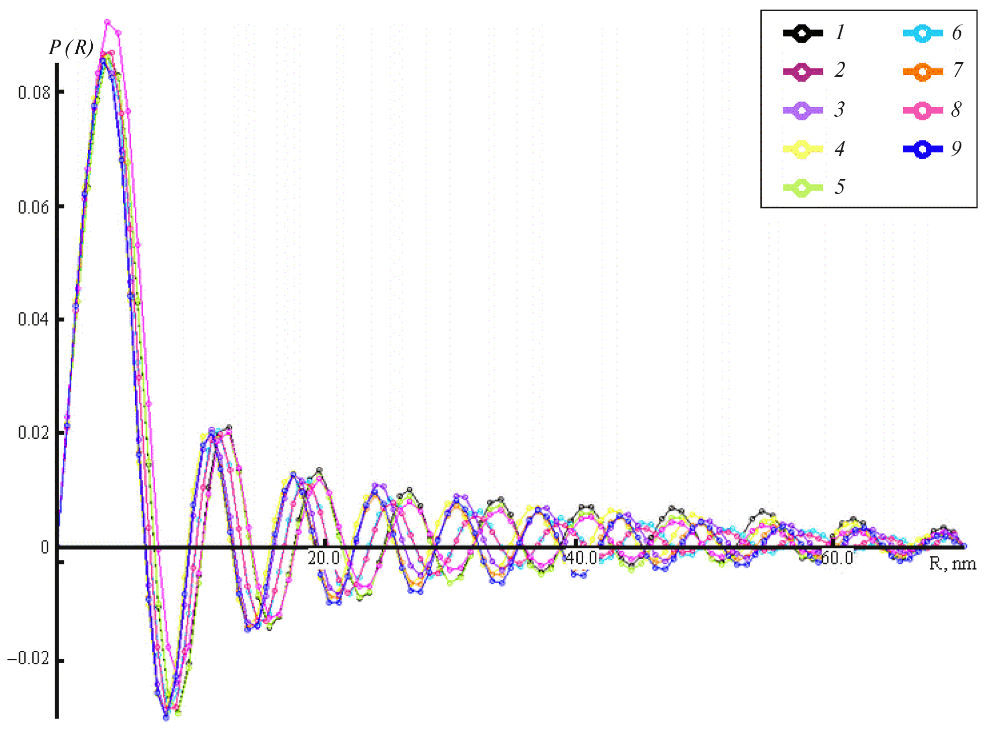 Рис. 3. Функции распределения парных расстояний P(R) образцов из табл. 2 и воздуха (9 на легенде), полученные по данным о размерах неоднородностей. Данные о размерах неоднородностей получены интегрированием одномерных кривых МУРР в PRIMUS. R – размер неоднородностей, нм