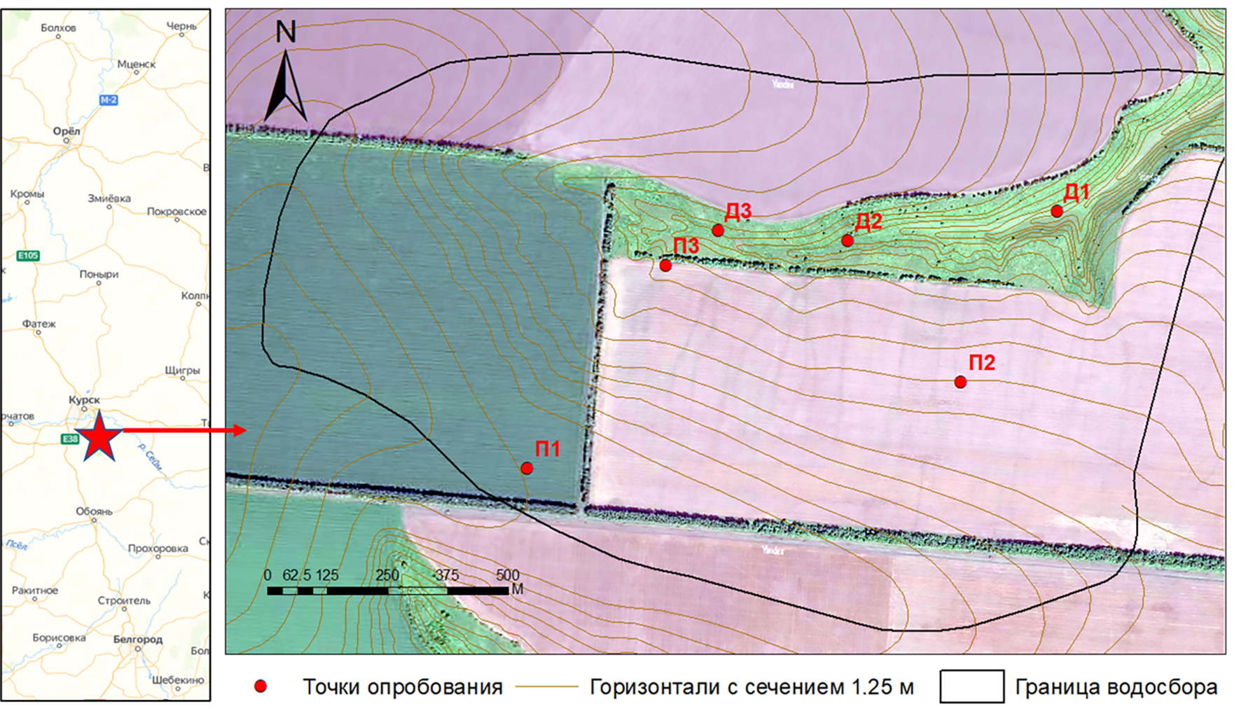 Рис. 1. Схема расположения малого водосбора (слева) и космический снимок малого водосбора с наложенными горизонталями и точками обследования почв (справа).